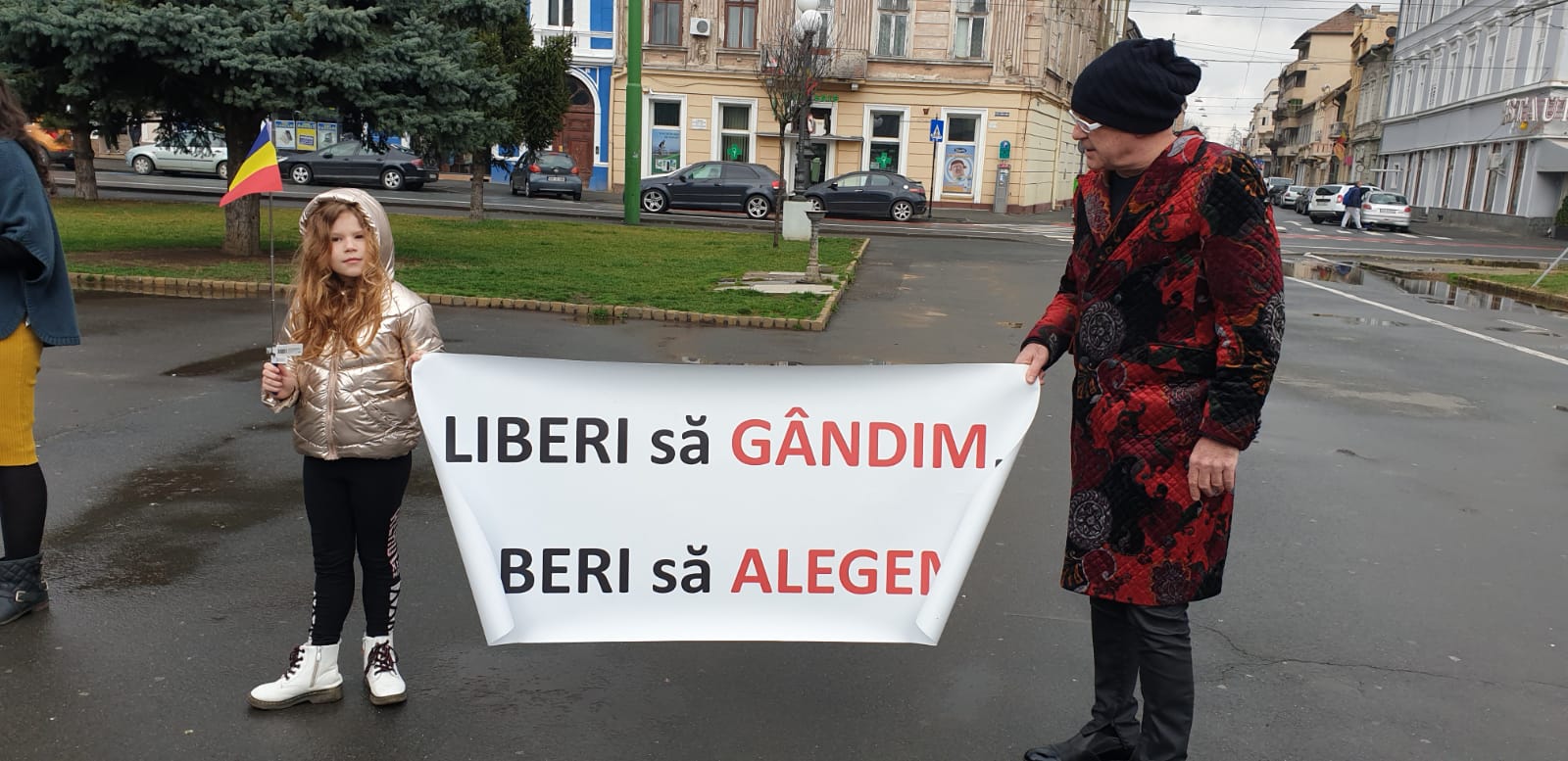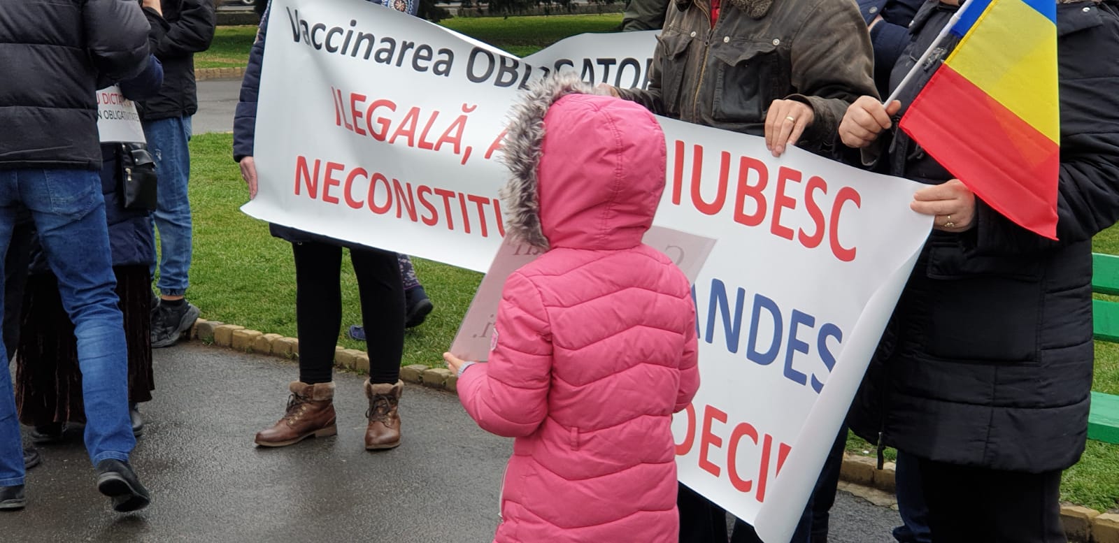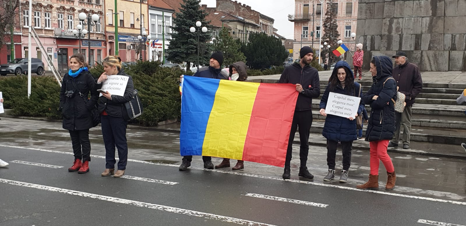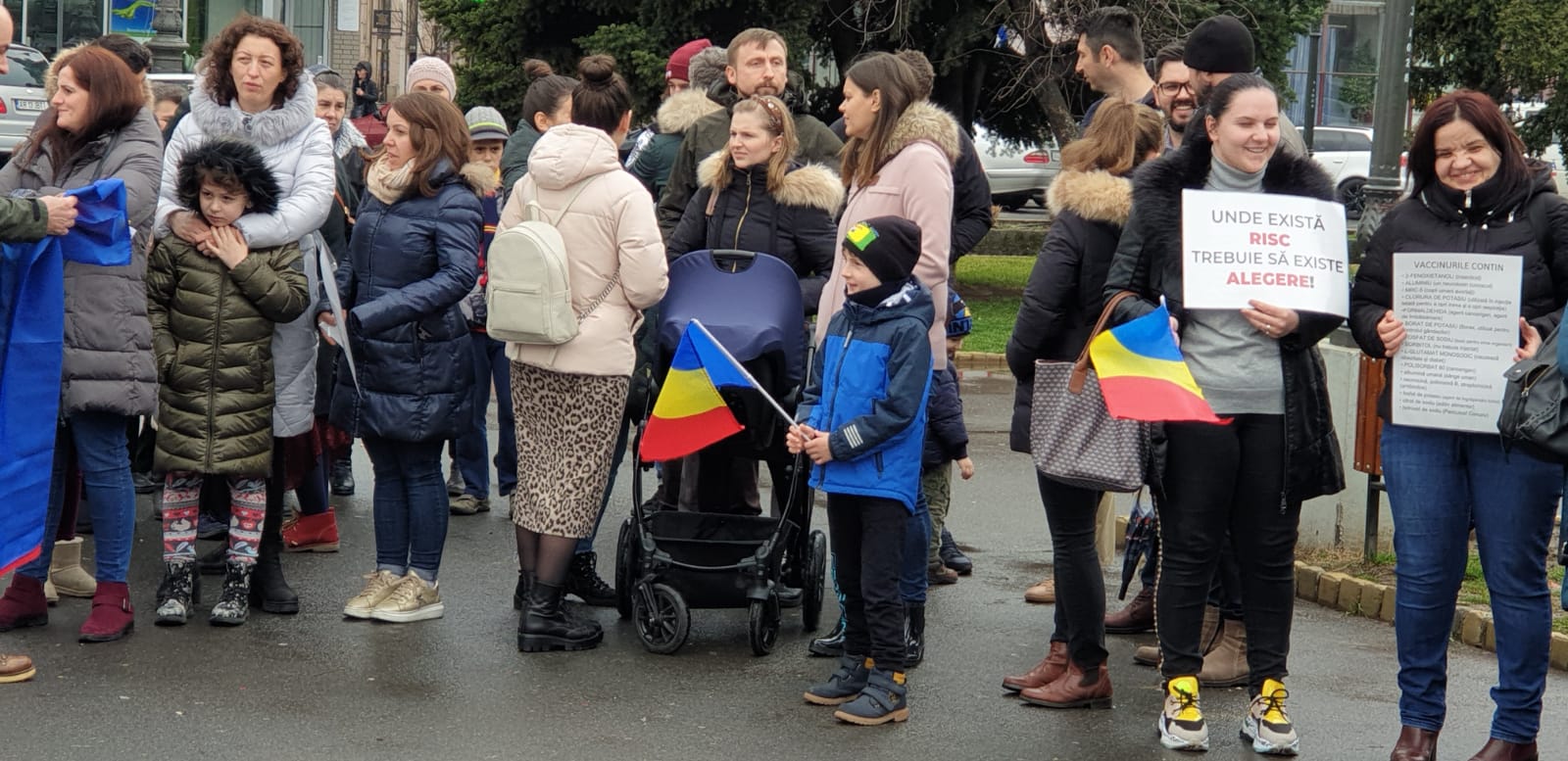 „Dacă există risc, există și dreptul de a alege” – scria pe una dintre pancartele purtată de o fetiță. Cu pancarte cu mesaje împotriva vaccinării sau a obligativității vaccinării și cu tricolorul românesc în mâini, oamenii s-au organizat pe o rețea de socializare, și s-au adunat în Piața Avram Iancu din centrul Aradului, nemulțumiți de faptul că, spun ei, vor fi obligați prin lege ca să-și vaccineze copii.
