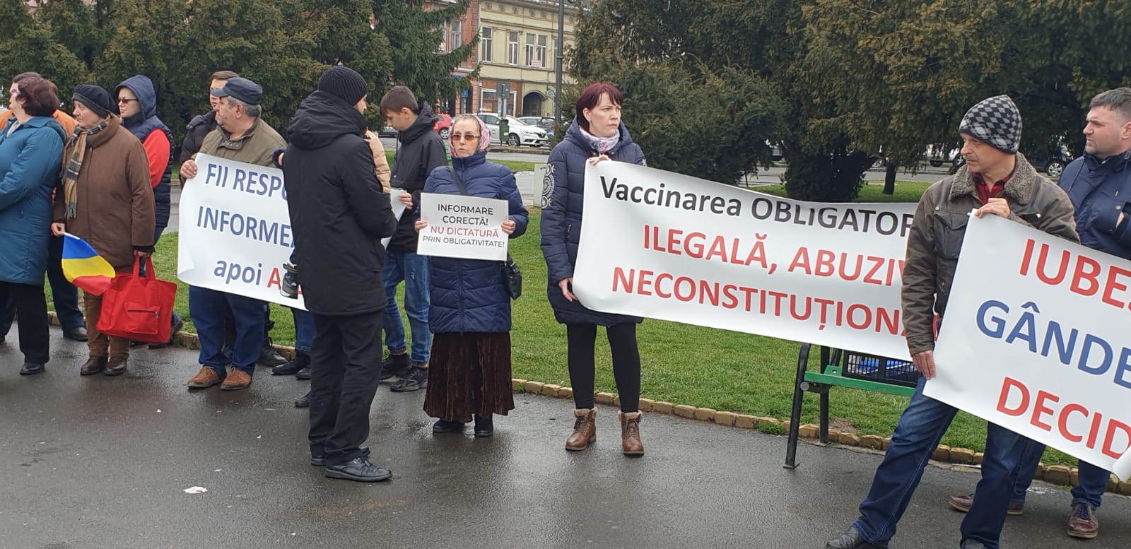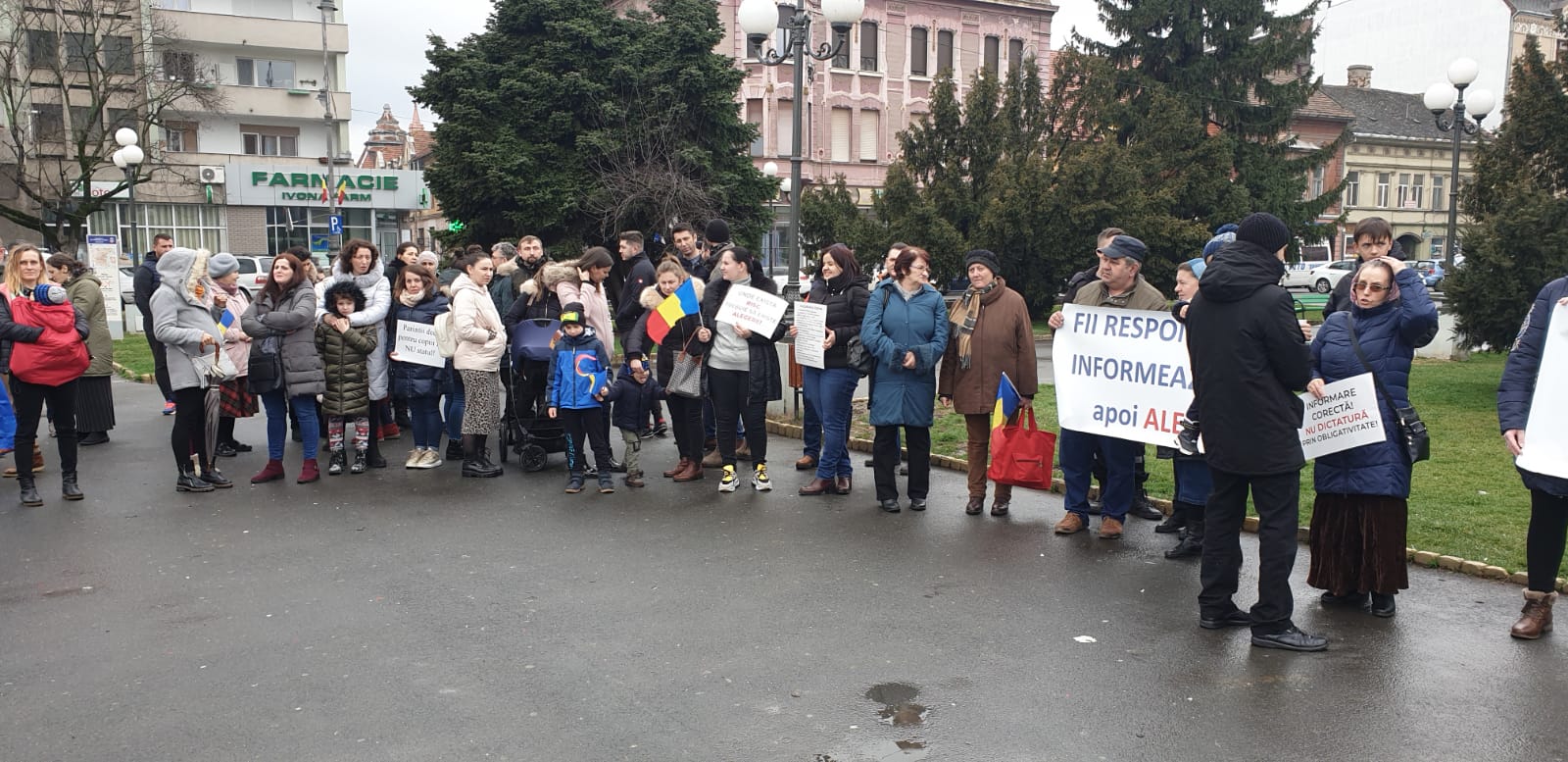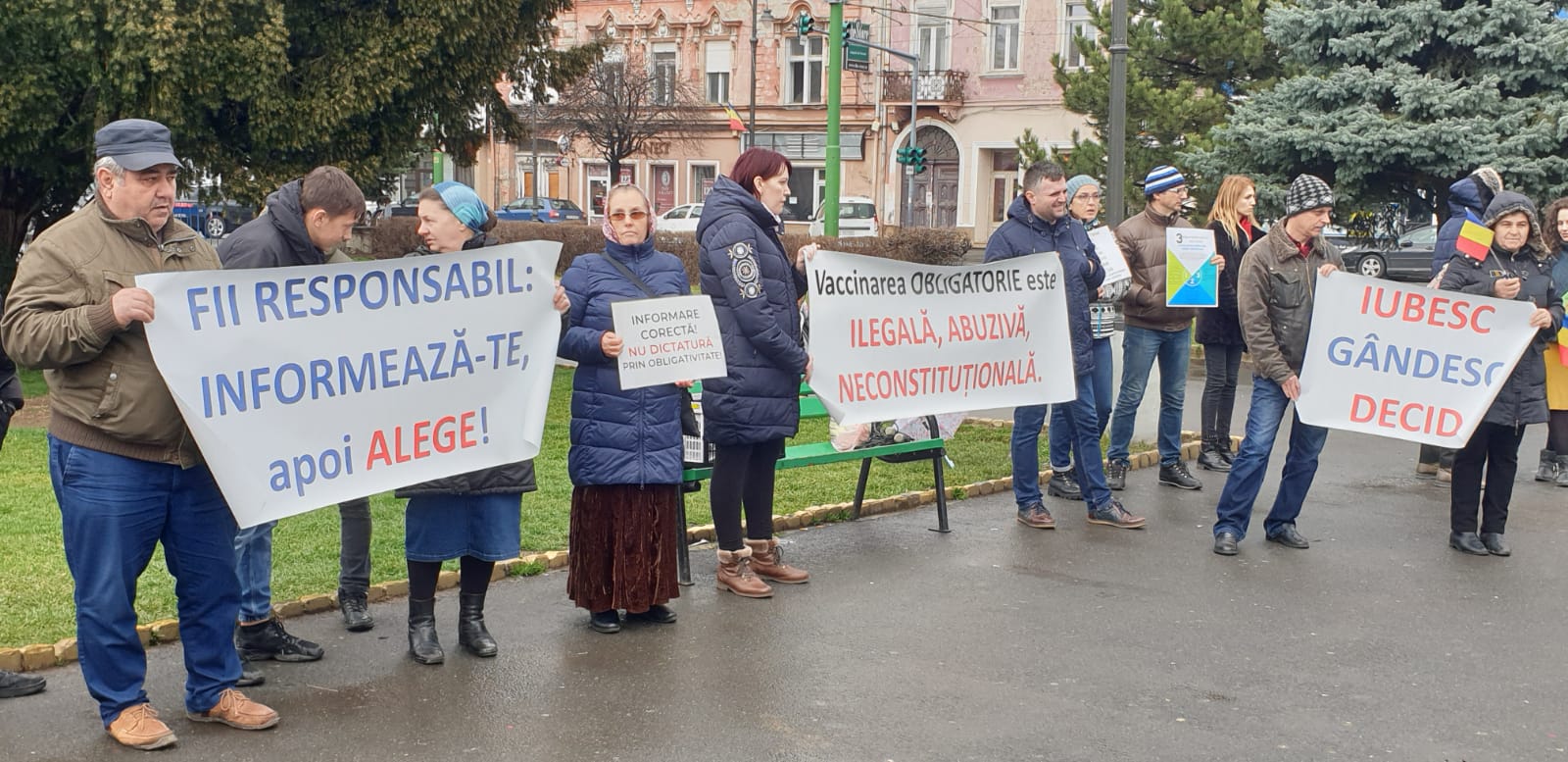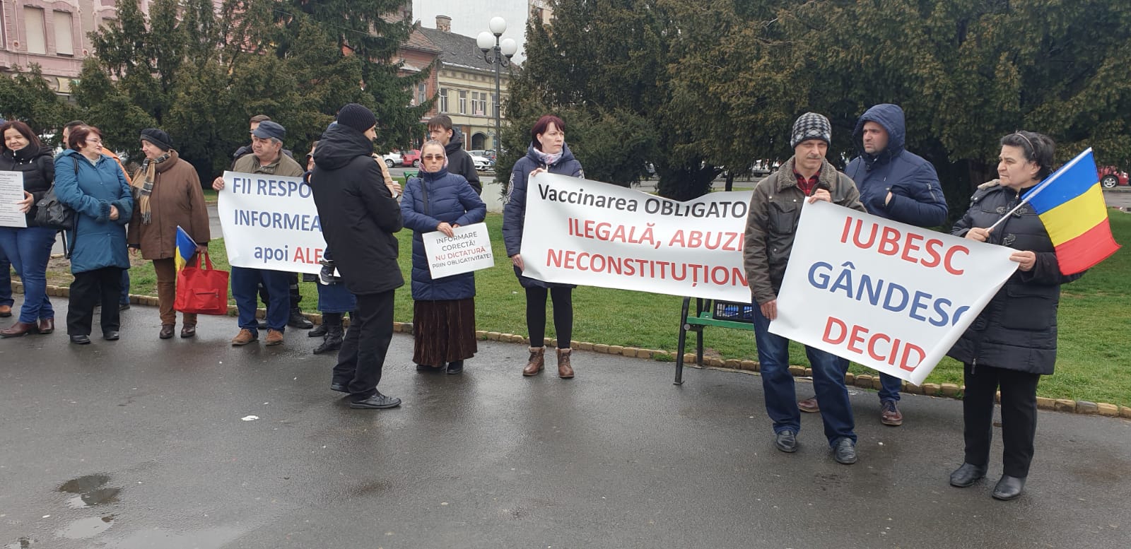 „Dacă există risc, există și dreptul de a alege” – scria pe una dintre pancartele purtată de o fetiță. Cu pancarte cu mesaje împotriva vaccinării sau a obligativității vaccinării și cu tricolorul românesc în mâini, oamenii s-au organizat pe o rețea de socializare, și s-au adunat în Piața Avram Iancu din centrul Aradului, nemulțumiți de faptul că, spun ei, vor fi obligați prin lege ca să-și vaccineze copii.