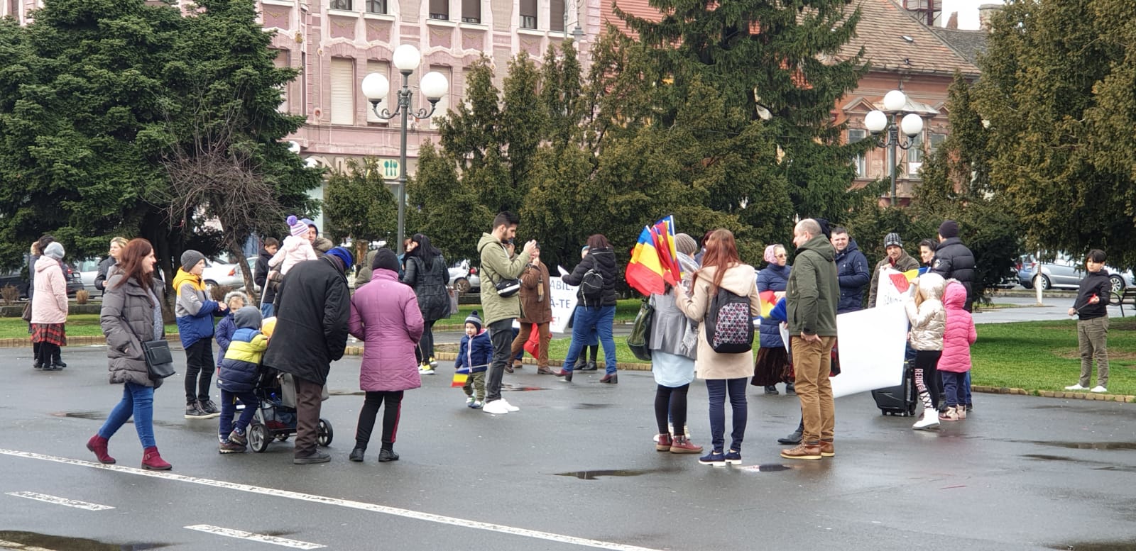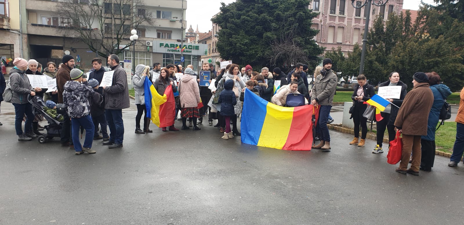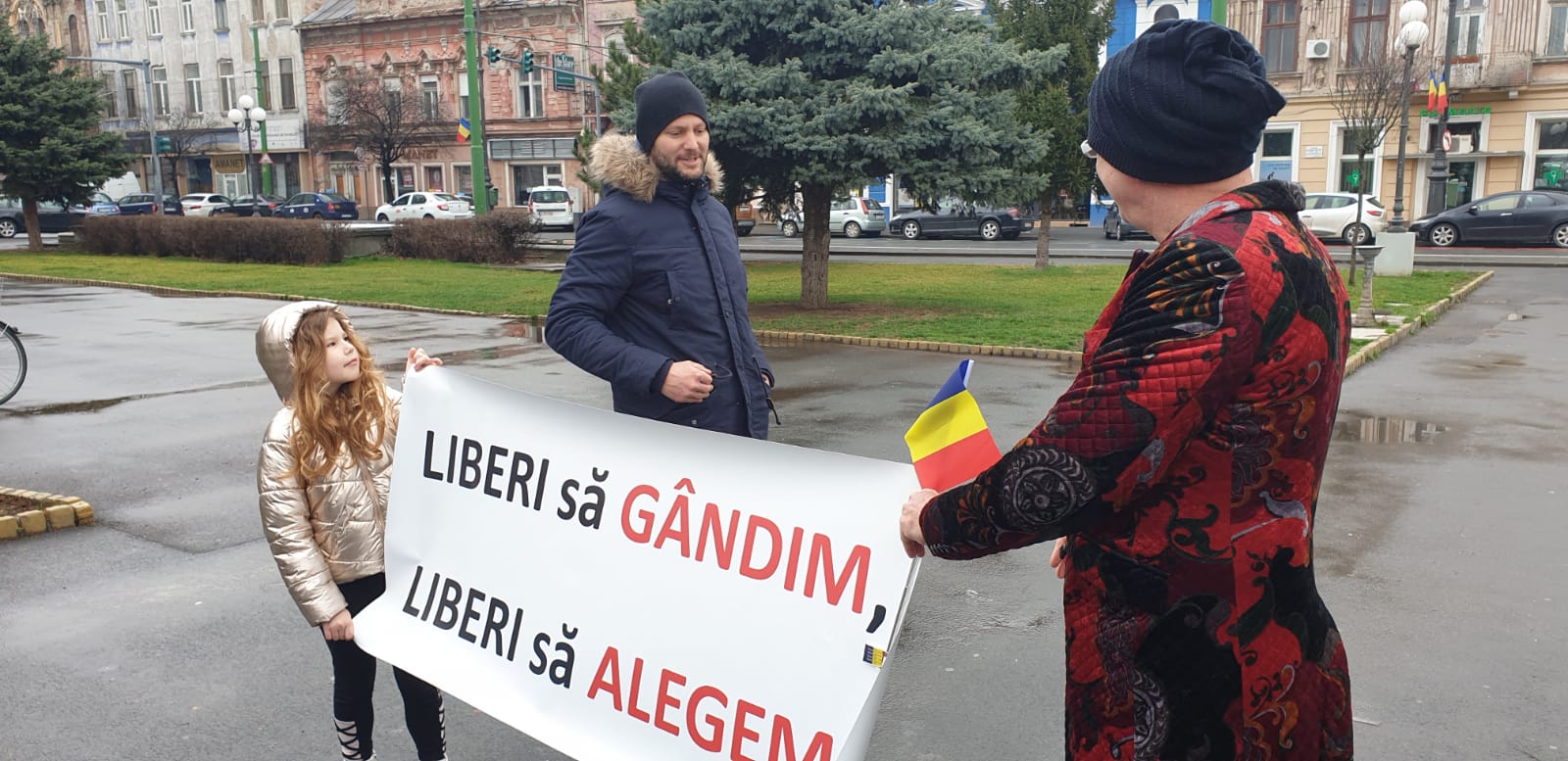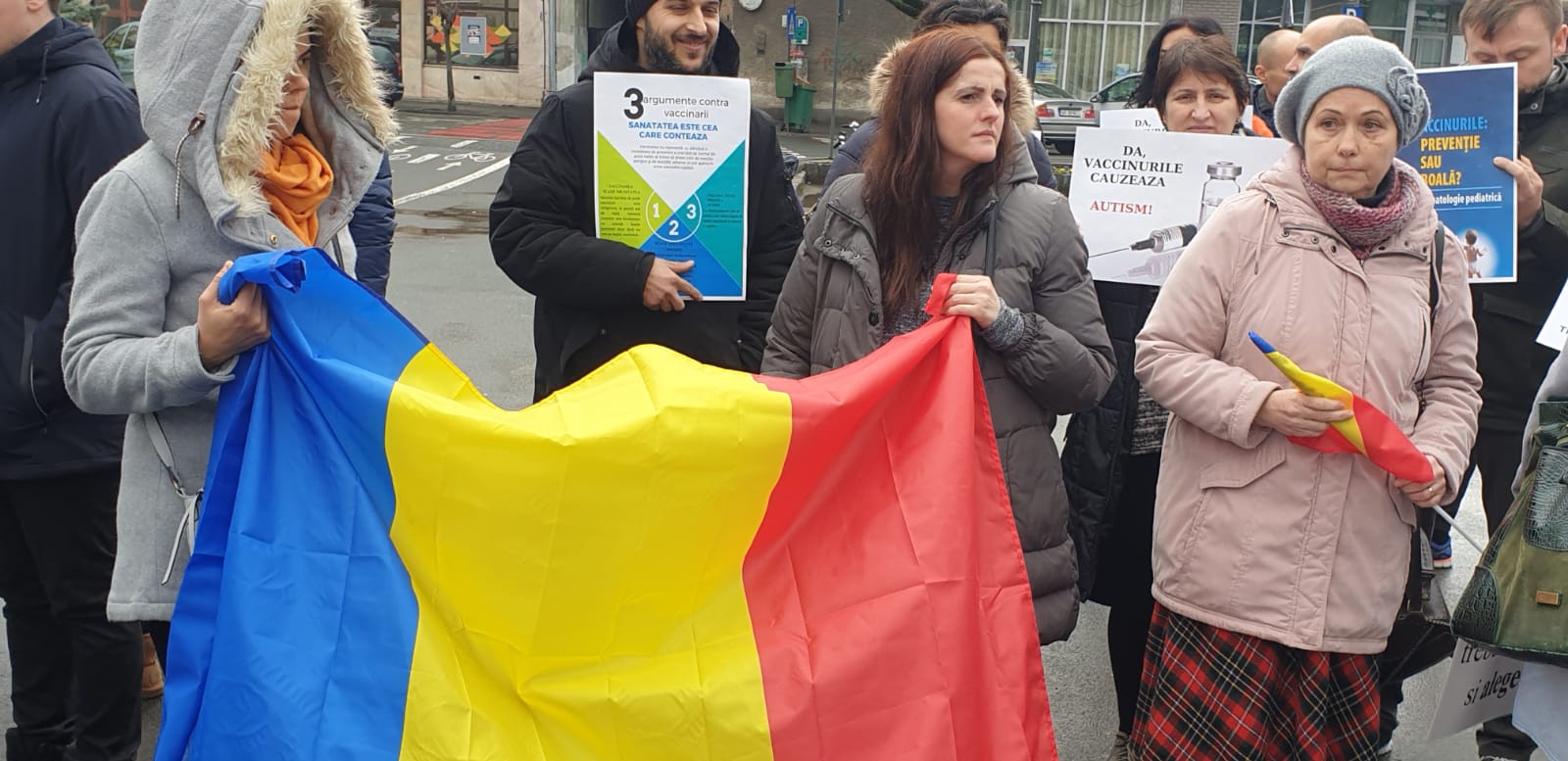 „Dacă există risc, există și dreptul de a alege” – scria pe una dintre pancartele purtată de o fetiță. Cu pancarte cu mesaje împotriva vaccinării sau a obligativității vaccinării și cu tricolorul românesc în mâini, oamenii s-au organizat pe o rețea de socializare, și s-au adunat în Piața Avram Iancu din centrul Aradului, nemulțumiți de faptul că, spun ei, vor fi obligați prin lege ca să-și vaccineze copii.