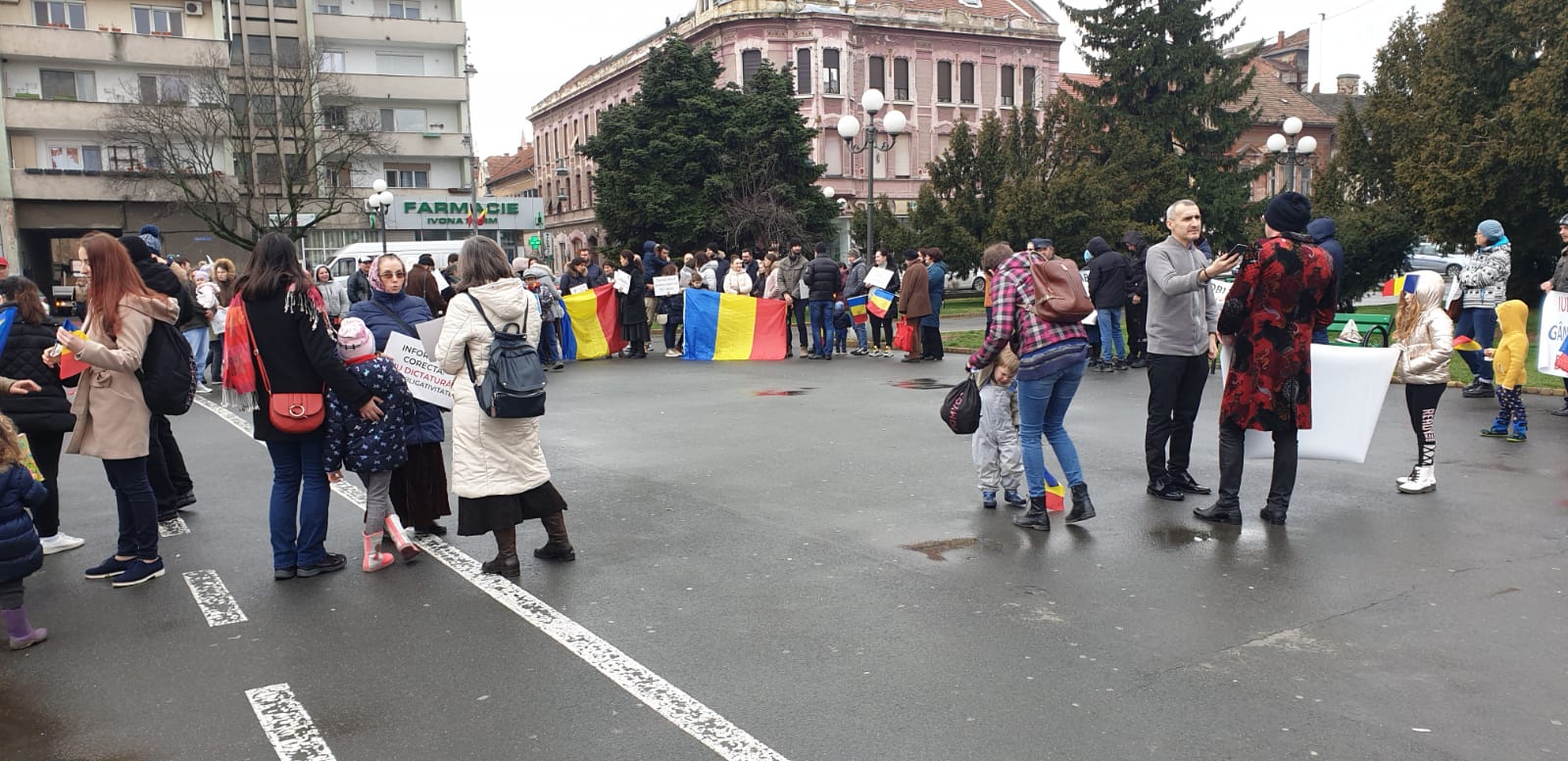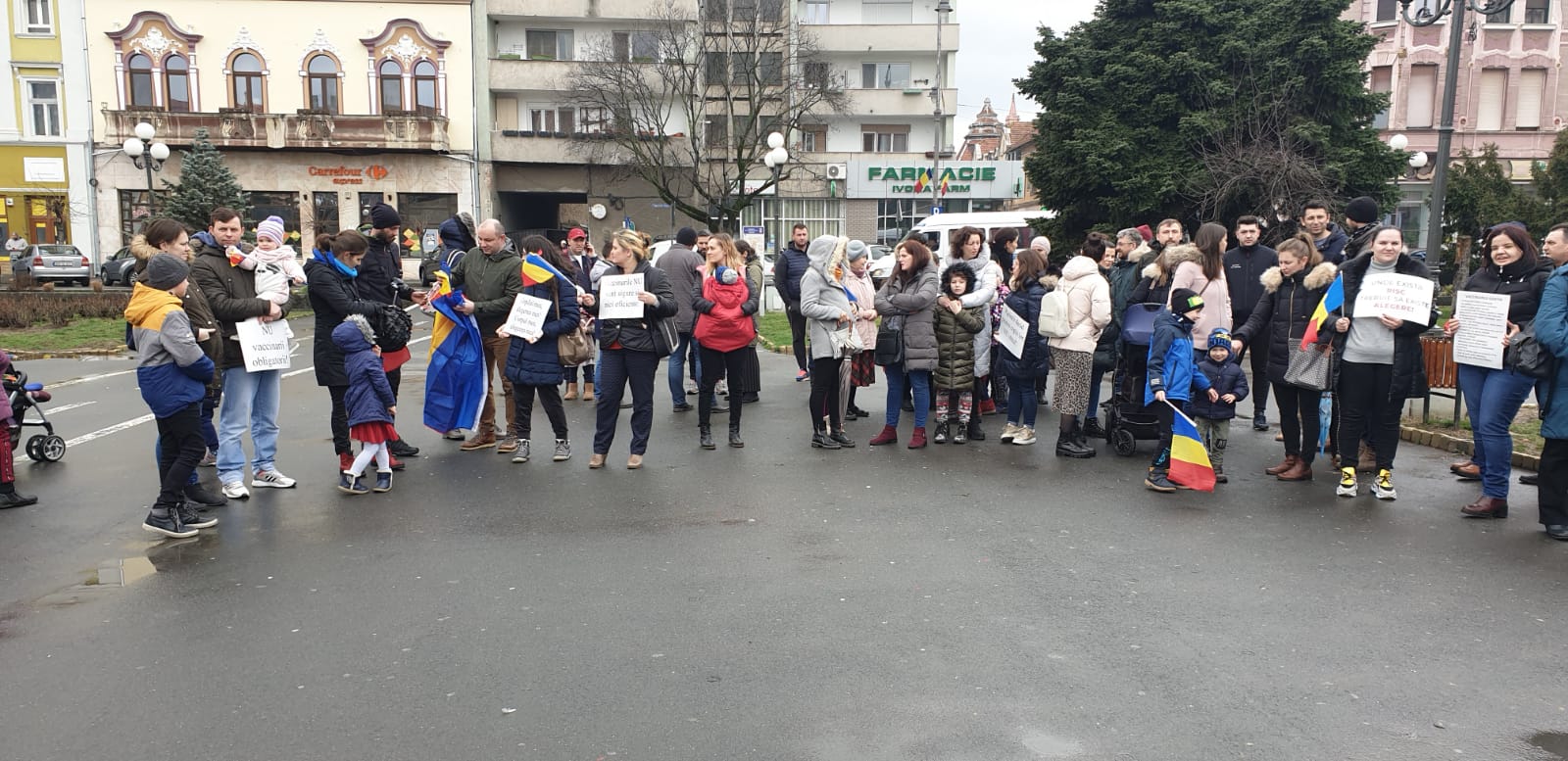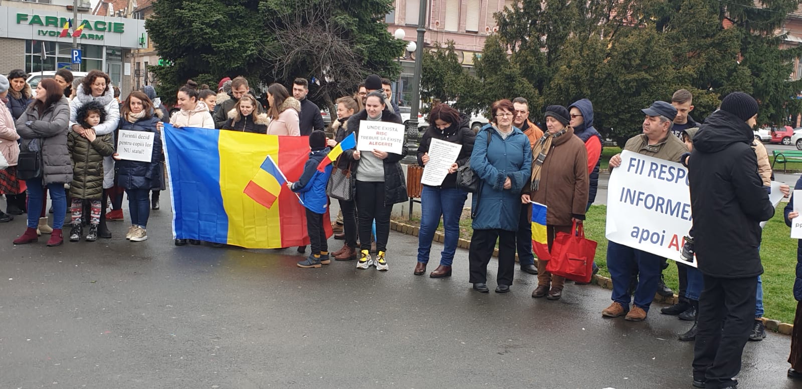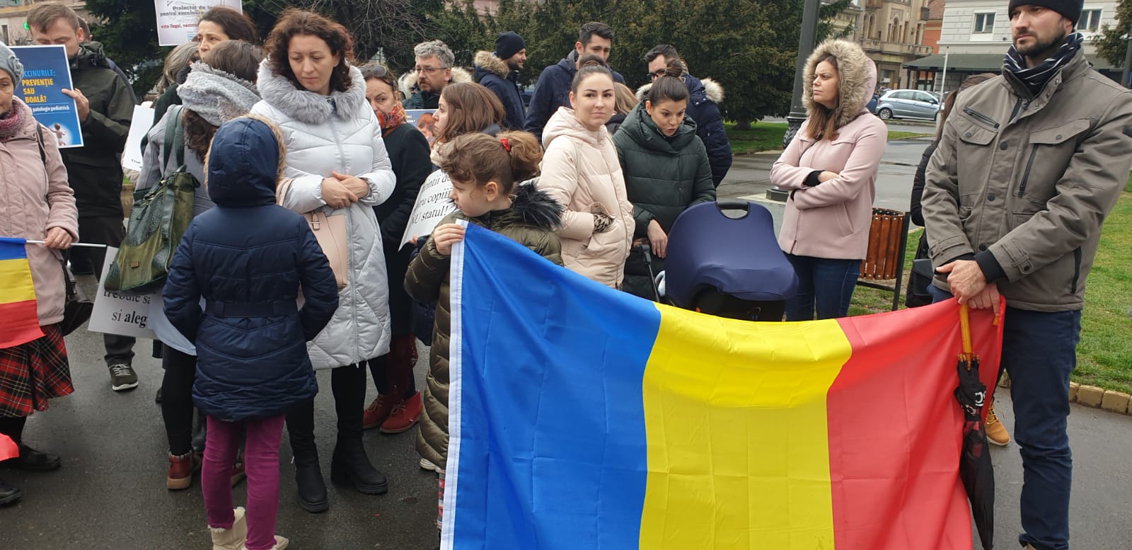 „Dacă există risc, există și dreptul de a alege” – scria pe una dintre pancartele purtată de o fetiță. Cu pancarte cu mesaje împotriva vaccinării sau a obligativității vaccinării și cu tricolorul românesc în mâini, oamenii s-au organizat pe o rețea de socializare, și s-au adunat în Piața Avram Iancu din centrul Aradului, nemulțumiți de faptul că, spun ei, vor fi obligați prin lege ca să-și vaccineze copii.