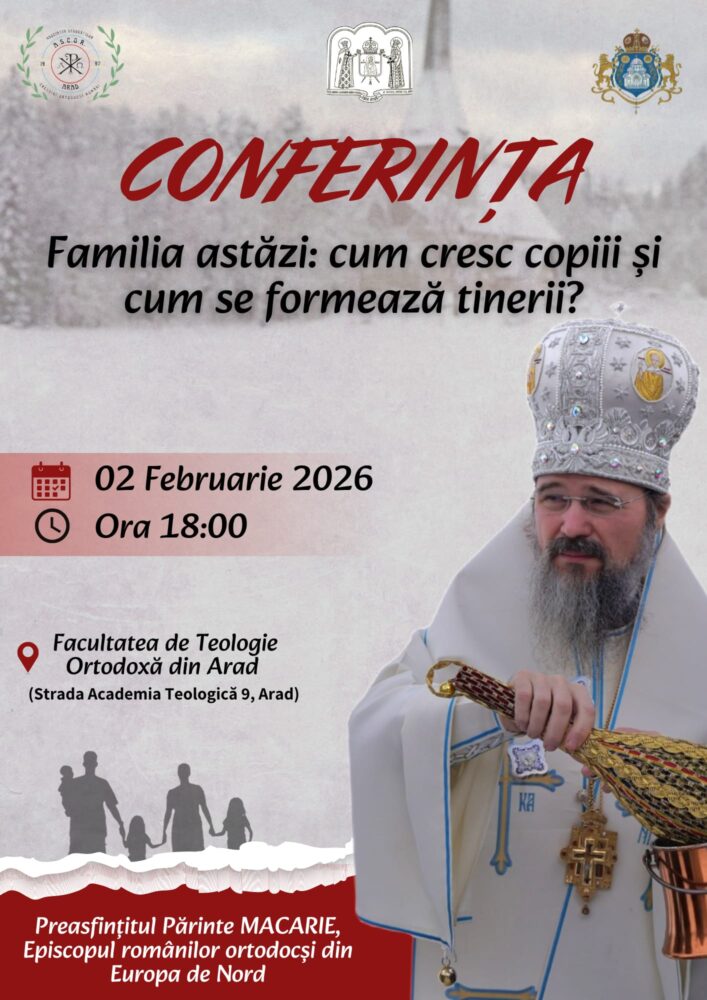 ASCOR Arad are bucuria de a invita publicul arădean la un eveniment deosebit, cu profundă încărcătură duhovnicească și educativă: conferința susținută de Preasfințitul Părinte Macarie, episcopul românilor ortodocși din Europa de Nord, intitulată: „Familia astăzi: cum cresc copiii și cum se formează tinerii?”
