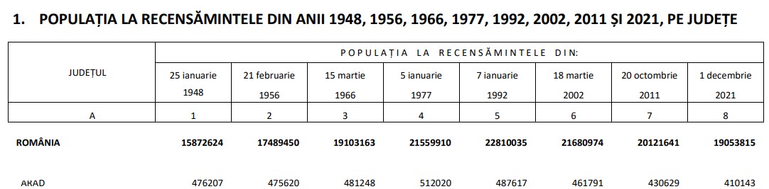 Institutul Național de Statistică a publicat primele date provizorii pentru Recensământul Populației și Locuințelor, runda 2021. Conform acestora, România are 19.053.815 locuitori, cu 1.067.826 de persoane mai puțin decât în 2011, la ultimul recensământ. Populația a scăzut constant, după 1989. Primul recensământ de după Revoluție arăta că țara are aproape 23 de milioane de locuitori.