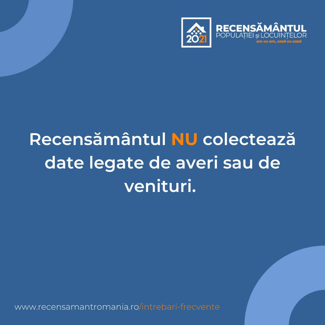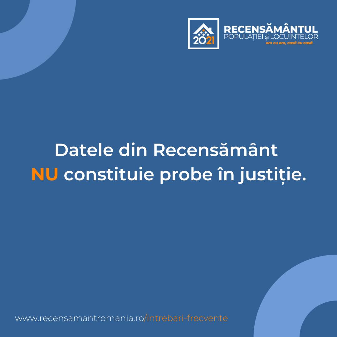 Așa că, INS vine cu precizări pentru cele mai dezbătute aspecte pe rețelele de socializare. Astfel, spune INS, datele din recensământ NU constituie probe în justiție, recensământul NU colectează date legate de consumul de metri cubi de gaze naturale, de gigacalorii sau kilowați; recensământul NU colectează date în scop fiscal, de taxare a proprietăților sau în scopul creării unei baze date individuale cu cetățenii României; recensământul NU colectează date legate de averi sau de venituri.