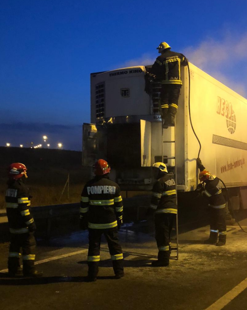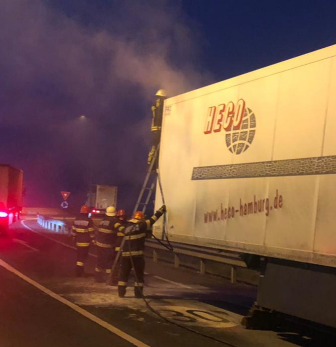 Detașamentul de Pompieri Arad din cadrul Inspectoratului pentru Situații de Urgență intervine cu un echipaj de stingere, pe Drumul Național 69, la ieșirea din cartierul Aradul Nou, unde remorca frigorifică a unui autocamion a fost cuprinsă de flăcări. Incendiu a izbucnit în apropiere de urcarea pe Autostrada A1, în vecinătatea a două benzinării.