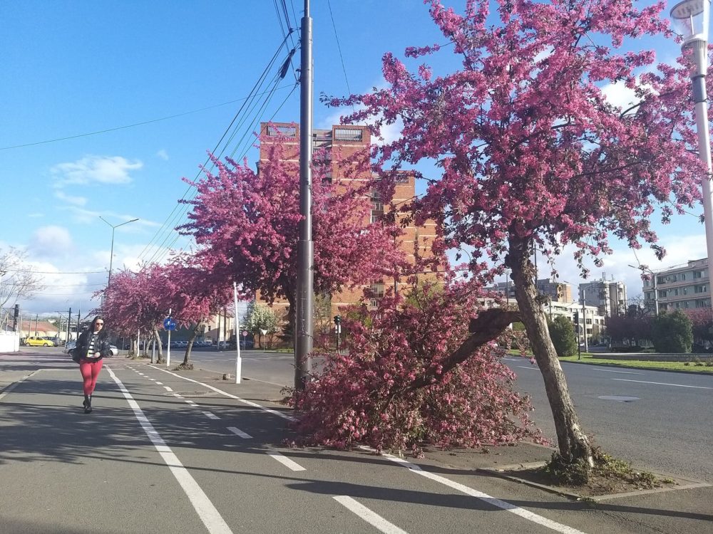 Venirea primăverii i-a umplut ramurile de culoare și a atras privirile pline de admirație a zeci de trecători. Însă, până să i se scuture petalele și să coloreze cu delicatețea lor de o zi trotuarul, copacul s-a rupt. Pe din două. Nu știm dacă este de vină vârsta copacului, care i-a slăbit „încheieturile” sau dacă la mijloc se afla intervenția unui factor extern, cum ar fi un cetățean prea dornic de a lua cu el din crengile pline de flori. Cert este că jumătate din frumosul copac zace pe trotuar, în zona Gării din municipiu, cumva simbolic pentru o primăvară plină de frământări.