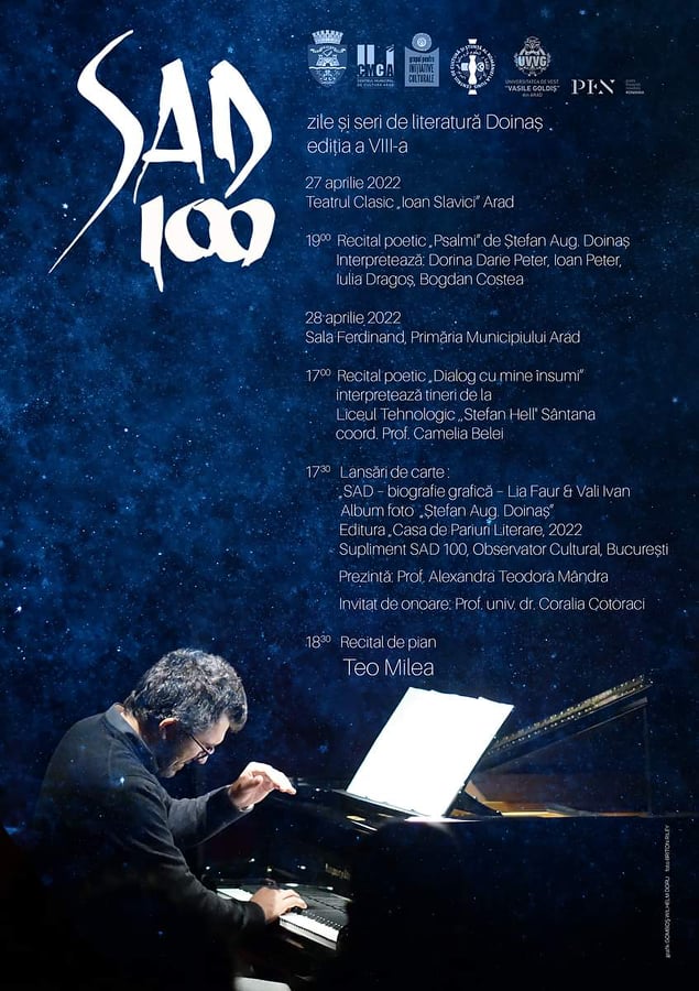 Joi, 28 aprilie 2022, SAD se mută în Sala Regele Ferdinand a Palatului Administrativ. De la ora 17.00 e programat recitalul poetic „Dialog cu mine însumi”, în interpretarea elevilor de la Liceul Tehnologic „Stefan Hell” din Sântana. De la 17.30 vor avea loc două lansări de carte („SAD – biografie grafică” – Lia Faur & Vali Ivan; Album foto „Ștefan Augustin Doinaș”, editura Casa Pariuri Literare, 2022) şi prezentarea Suplimentului SAD 100, Observator Cultural, București (prof. Alexandra Teodora Mândra). Invitat de onoare al evenimentului este prof. univ. dr. Coralia Cotoraci.