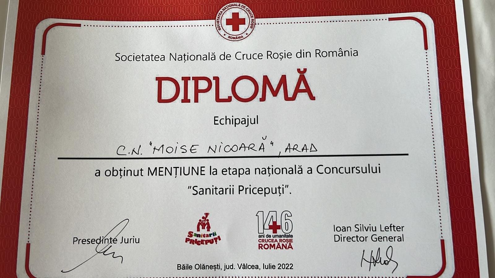 Echipajul arădean a fost format din elevii: Anastasia Olăriu, Iulia Moldovan, Rareș Giurgiu, Giulia Onetiu şi Andreea Tănasă. „Cu multă pregătire și cu implicare maximă din toate punctele de vedere, sub stricta supraveghere a doamnei asistente medicale Anda Scolobiuc, echipajul sanitarilor pricepuţi de la Colegiul Naţional <Moise Nicoară> a reușit să obţină mențiune. Chiar dacă s-au aflat la 5 puncte de locul I, pentru noi, ca filiala arădeană, ei sunt cei mai buni, emoțiile fiind factorul care a stat în faţa celei mai înalte trepte a podiumului. Îi felicităm pentru rezultatul deosebit pe care au reușit sa îl atingă” – spune dr. Beniamin Dragoş, preşedintele Crucii Roşii Arad.