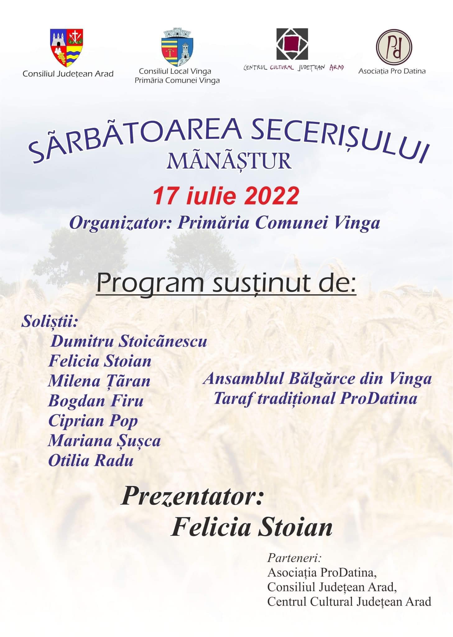 Organizată de Primăria Vinga în parteneriat cu Parohia Ortodoxă Mănăştur, Asociaţia ProDatina, Consiliul Judeţean şi Centrul Cultural Judeţean, Sărbătoarea Secerişului a debutat duminică după-masă, la biserică, apoi a continuat la Căminul Cultural.