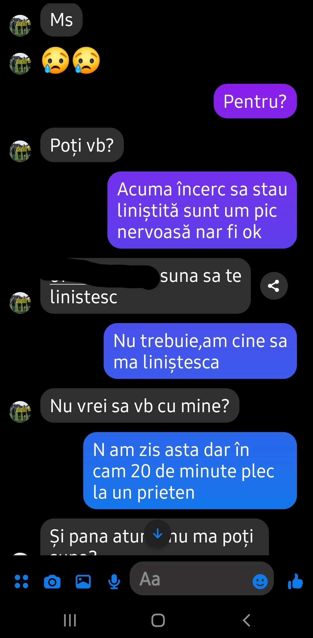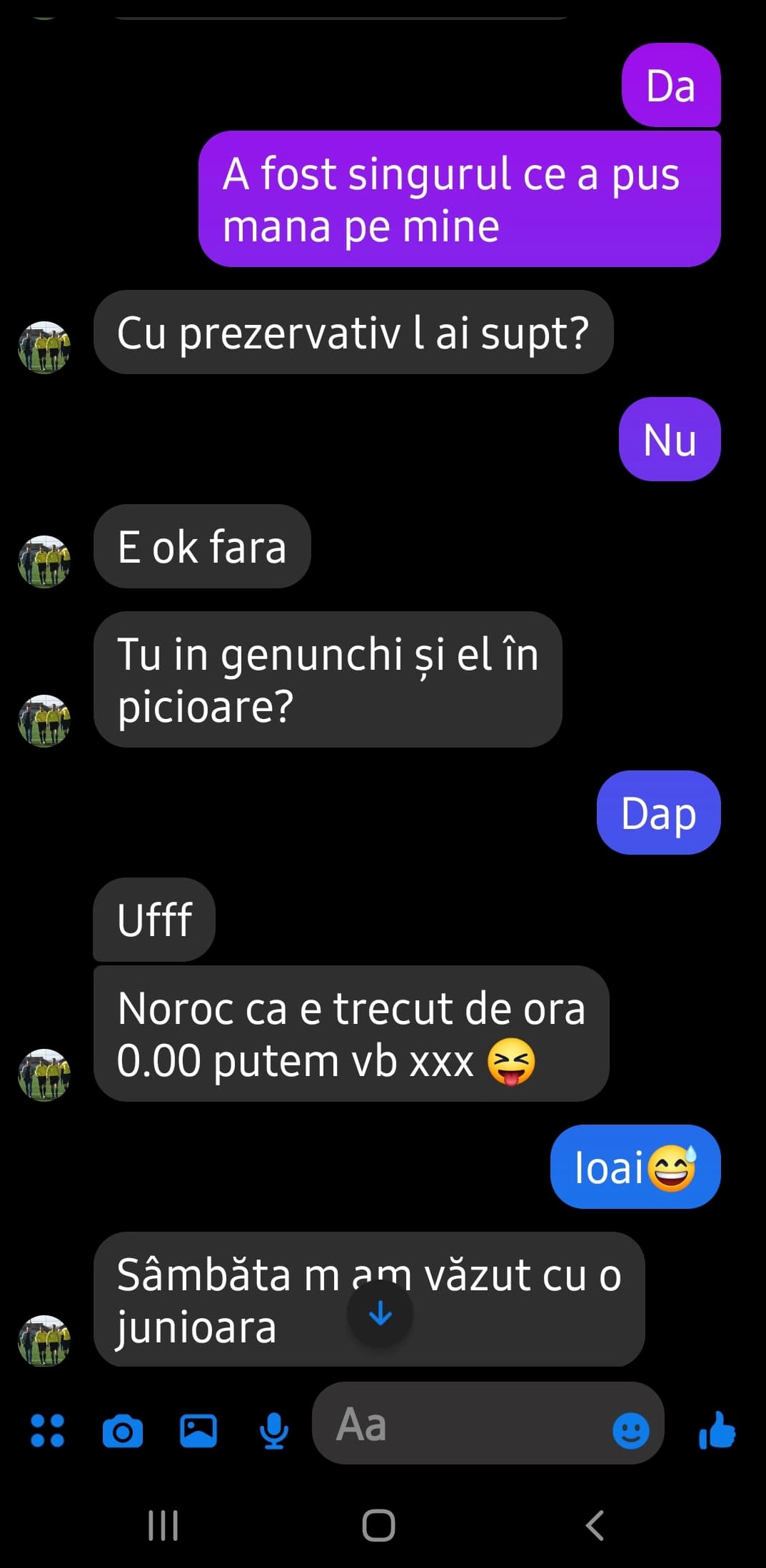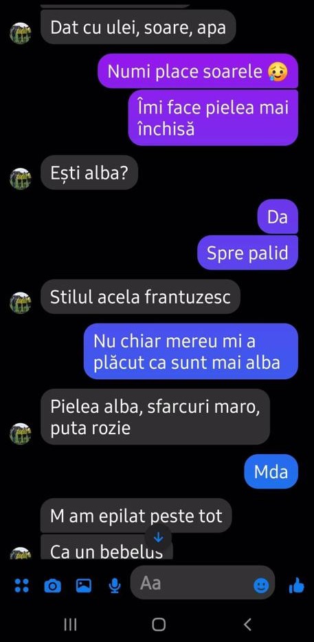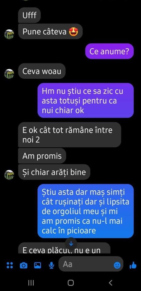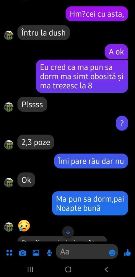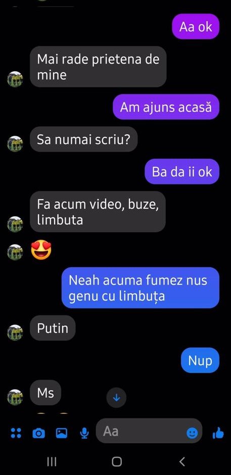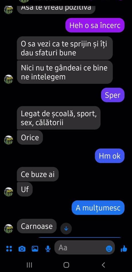 De la primul mesaj fata trebuia sa-l blocheze. De cand e lumea barbatii sunt atrasi de femei mai ales de cele ce “ridică coada” . Fata i-a dat apă la moară, el prostu a pus botul si iată ce a pățit. I-a mergeți dimineată pe la poarta școlilor sa vedeti domnisoarele ce ținute și comportament au. De machiaj nu mai zic