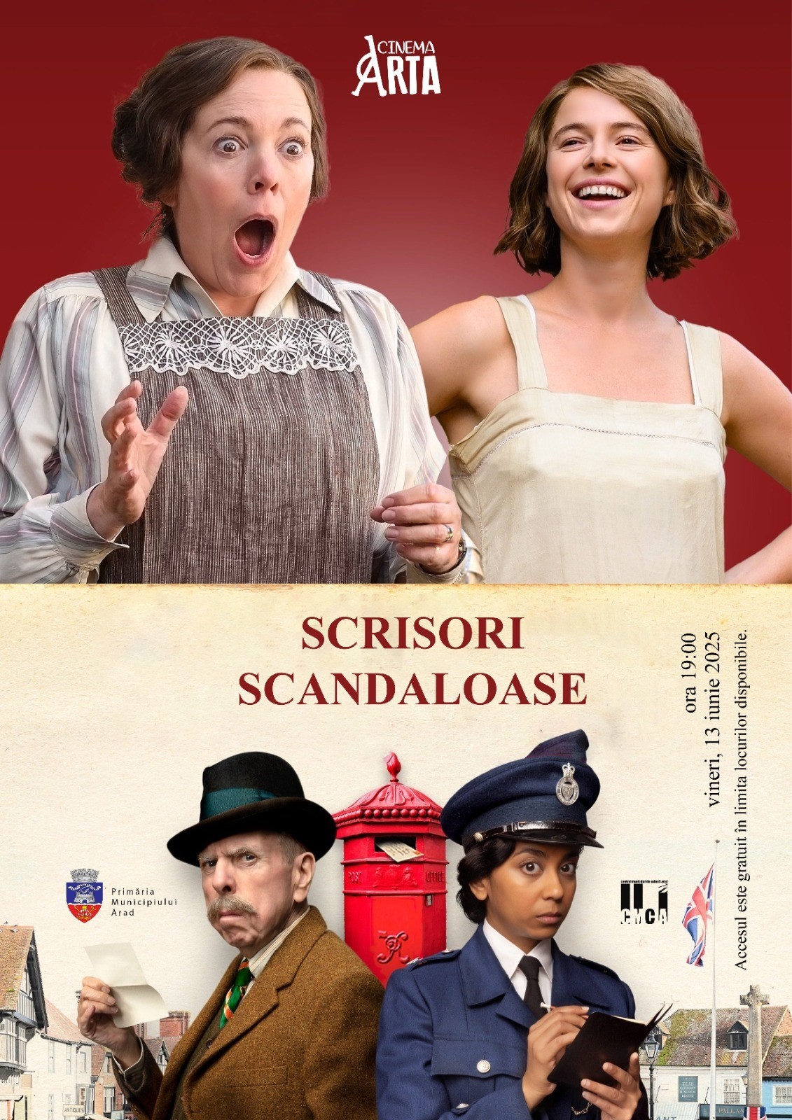Filmul „Scrisori scandaloase”/„Wicked Little Letters” (r. Thea Sharrock ), bazat pe o poveste adevărată, care are în centru un grup de vecini care se străduiesc împreună să rezolve împreună un caz complicat, va fi proiectat la Cinematograful „Arta” din Arad. Proiecția va avea loc vineri, 13 iunie 2025, de la ora 19.00. Accesul publicului va fi gratuit, în limita locurilor disponibile.