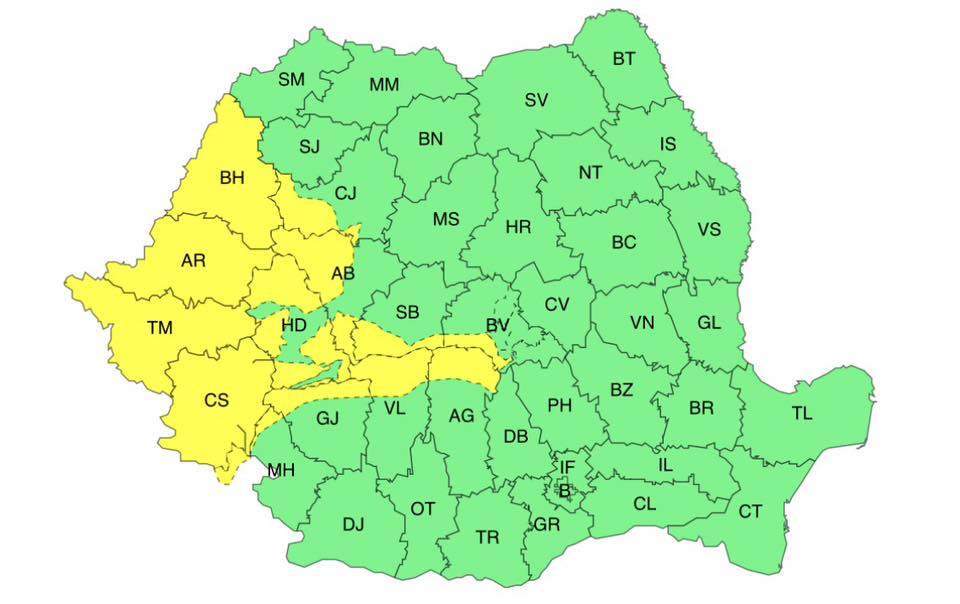 Un prim cod galben emis de ANM va intra în vigoare joi, 23 octombrie, la ora 21:00, și va fi valabil până vineri, 24 octombrie la ora 10:00. „În Banat și Crișana vântul va avea intensificări temporare cu viteze de 50…70 km/h. În Carpații Occidentali și în cea mai mare parte a Carpaților Meridionali vor fi intensificări ale vântului cu viteze de 70…90 km/h, iar la peste 1700 m vor fi rafale de 90…110 km/h”, spun meteorologii.
