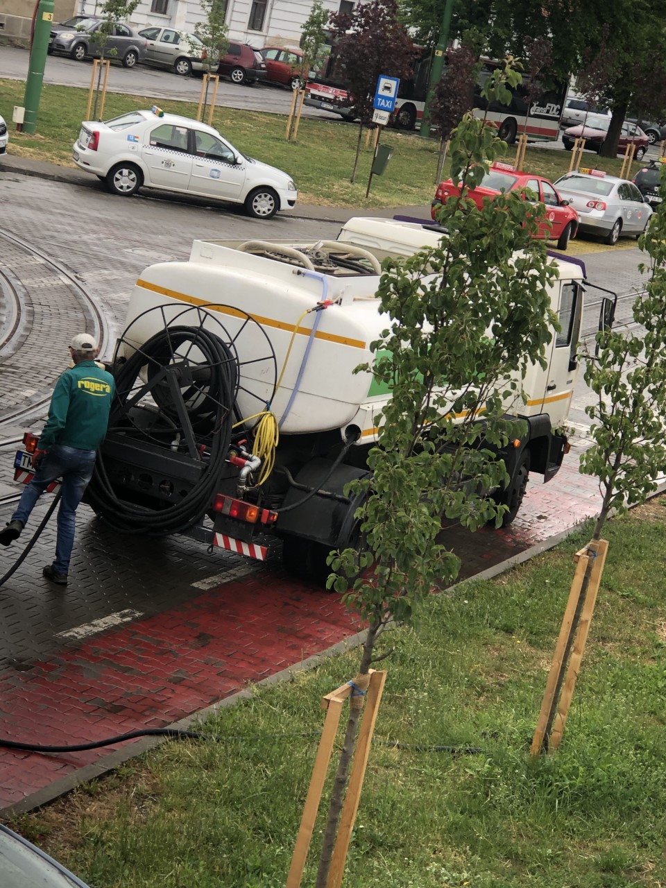 ARAD. Nu a contat că pe parcursul zilei au fost mai multe reprize de ploaie, angajații firmei au ieșit la udat. Trebuie menționat că zilele trecute, când temperaturile au fost destul de ridicate pentru această perioadă a anului, nimeni nu s-a încumetat să ude spațiile verzi în zonă. Le-a venit rândul acum, pe timp de ploaie.