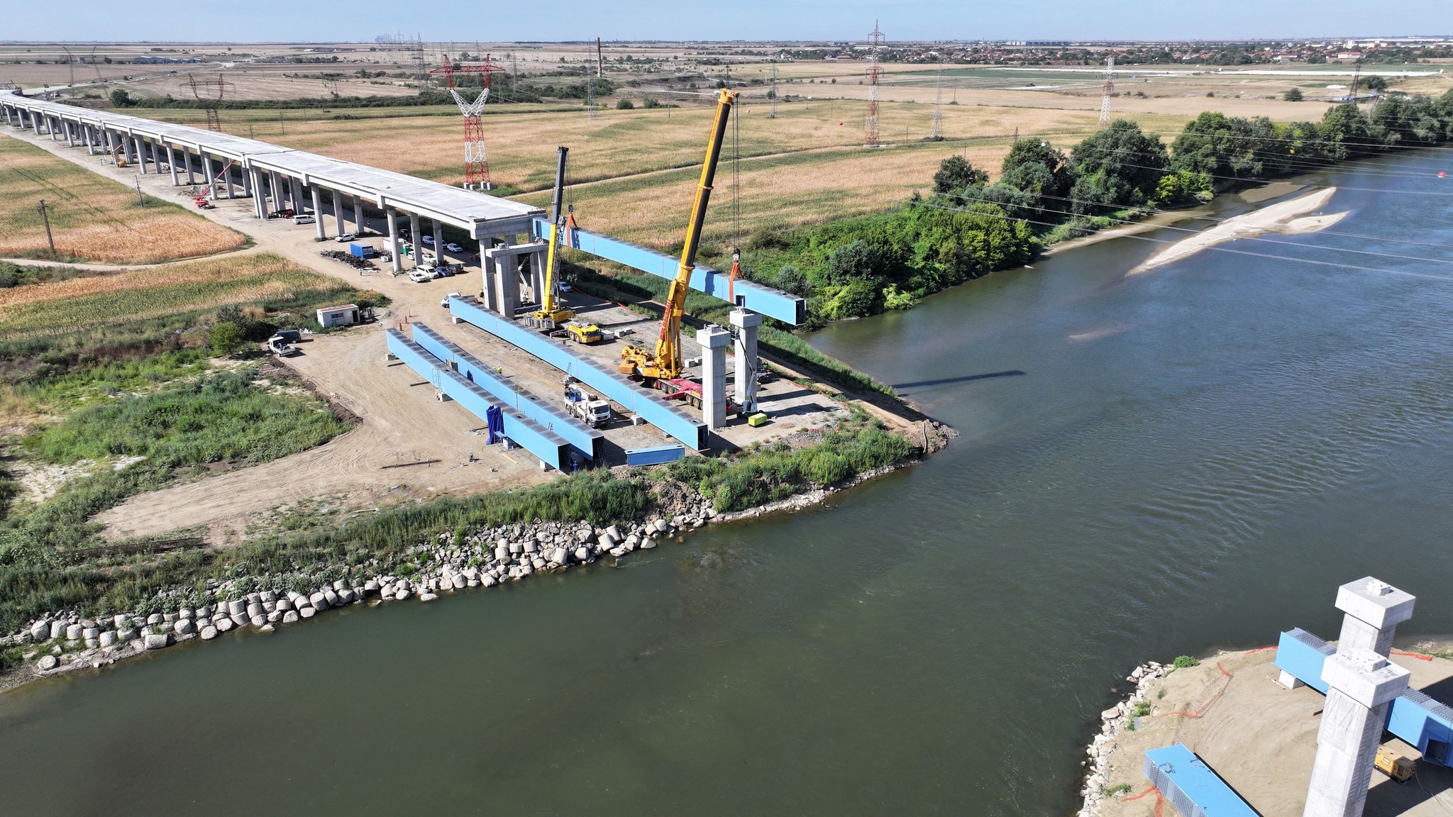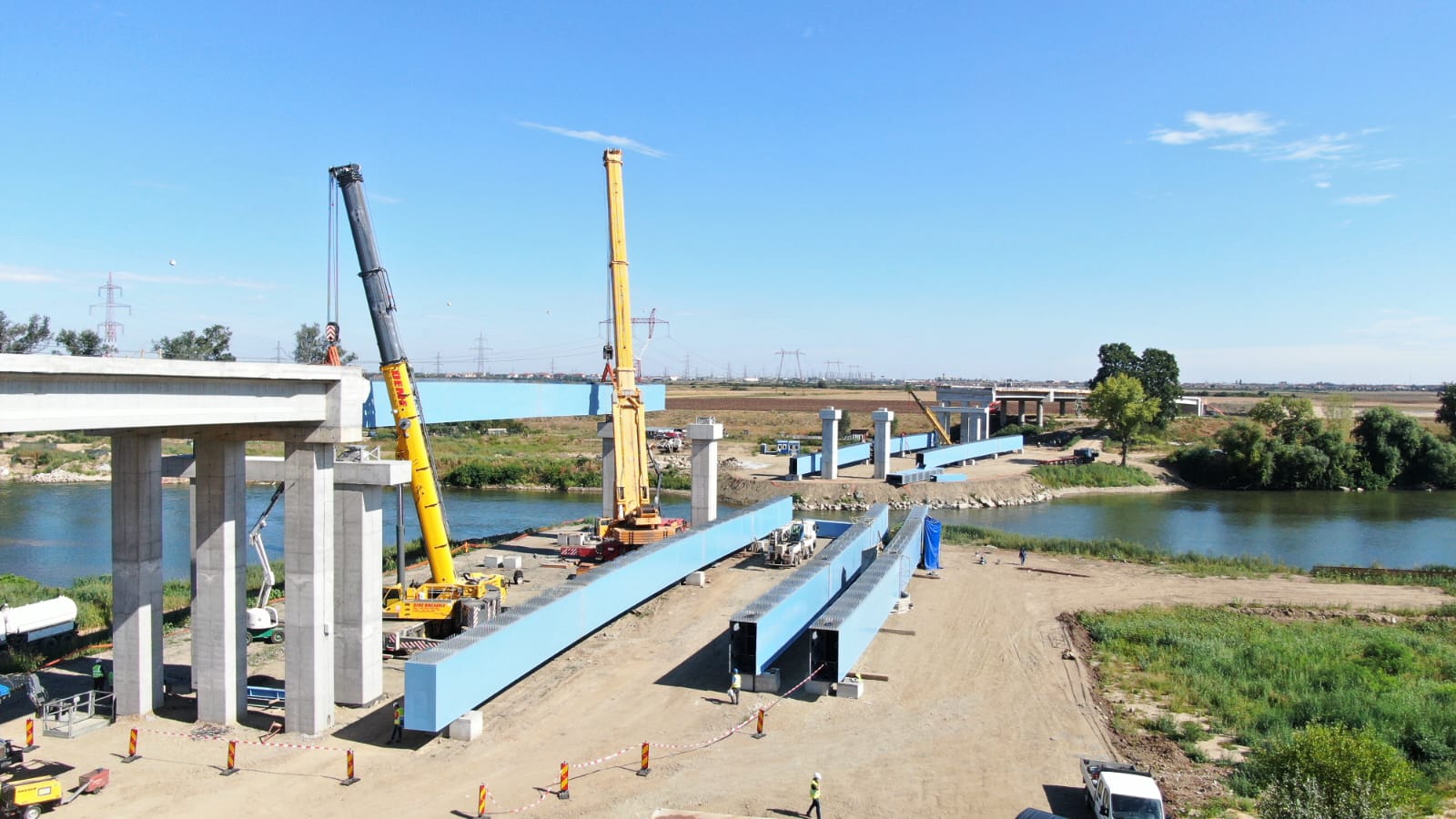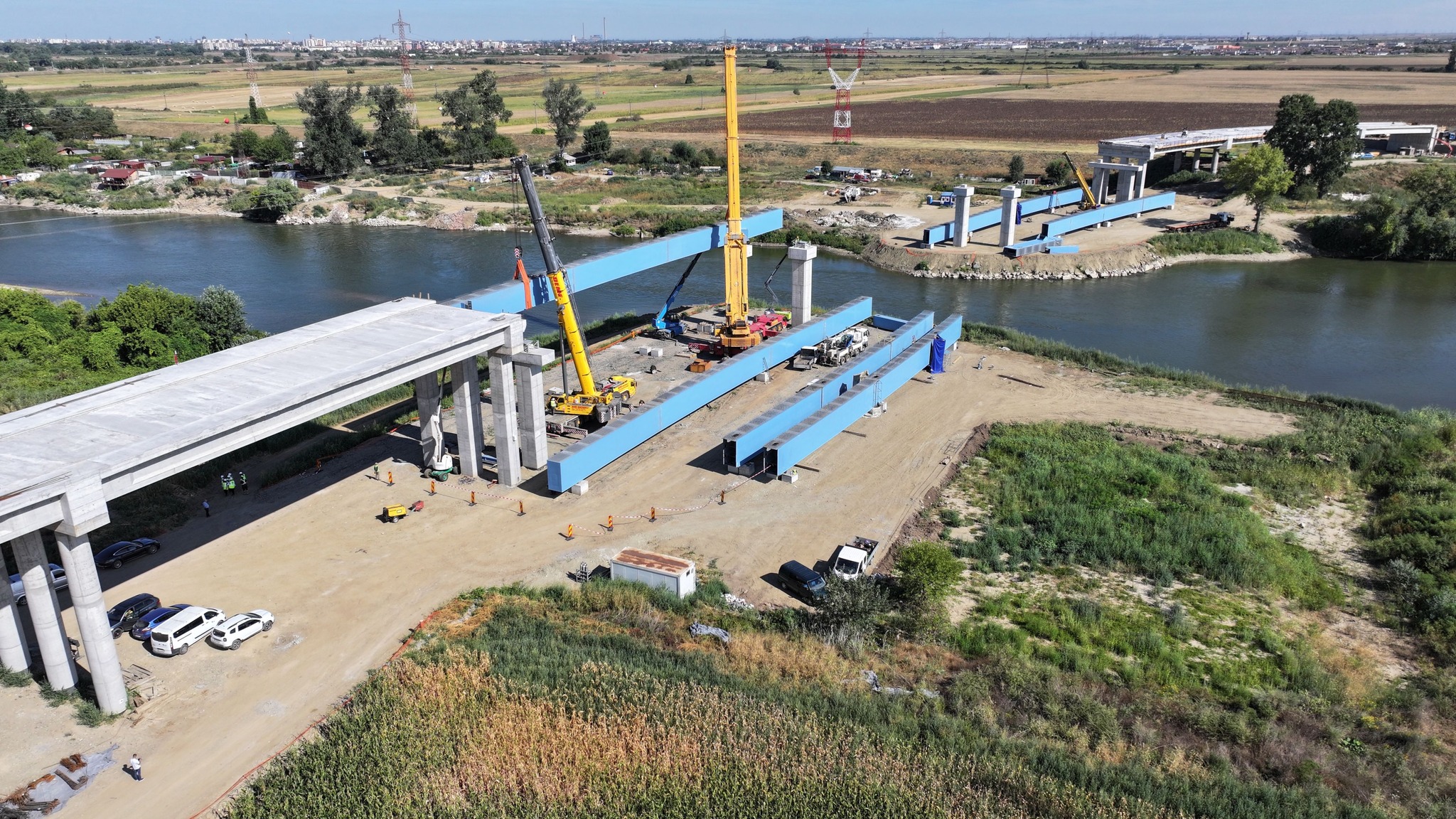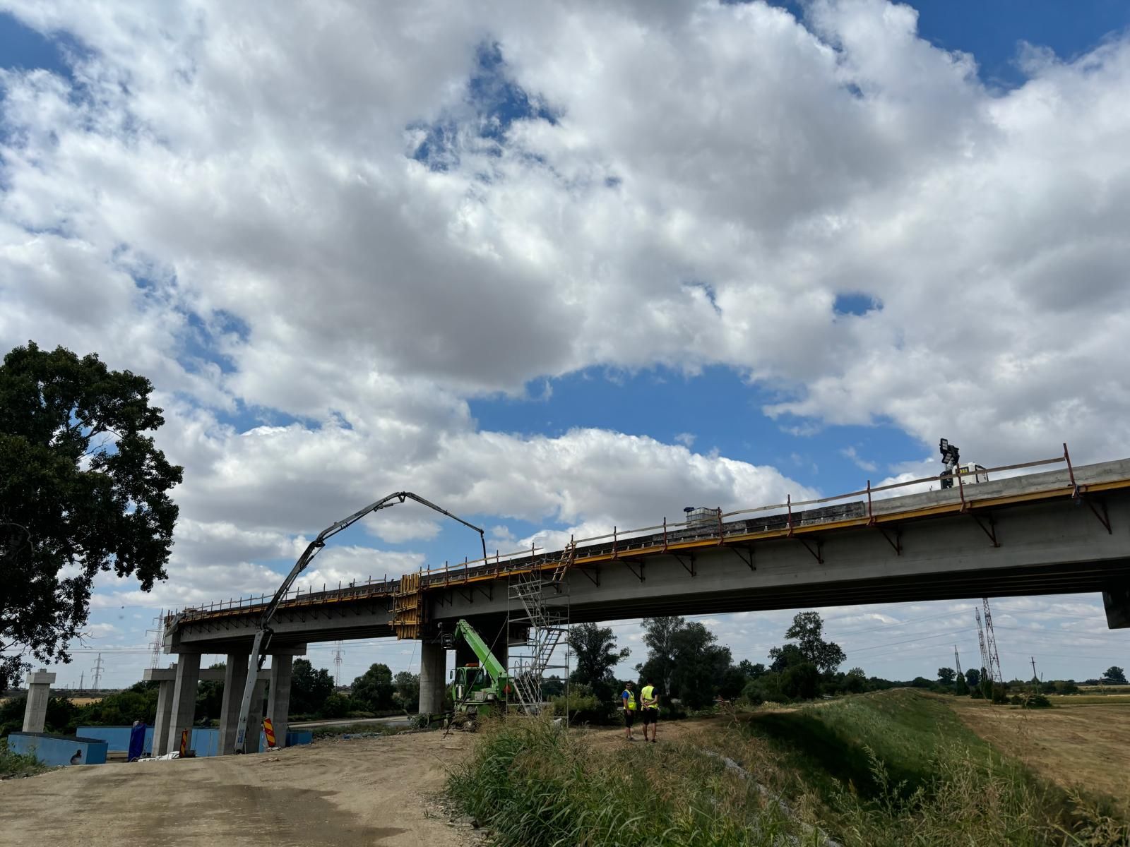 La lucrarea începută vineri au fost prezenți și reprezentanții companiei PORR, ai Direcției Regionale de Drumuri și Poduri Timiș, directori și șefi serviciu ai Consiliului Județean, implicați în proiect. Puse cap la cap, grinzile care traversează Mureșul vor avea 206 metri, adică 20 la sută din lungimea întreagă a podului.