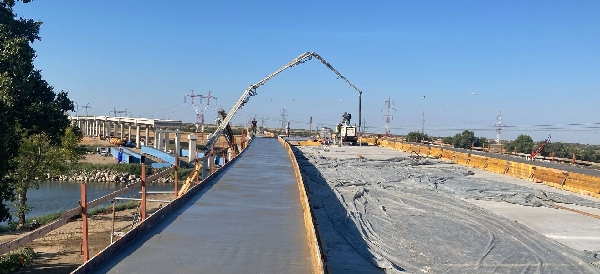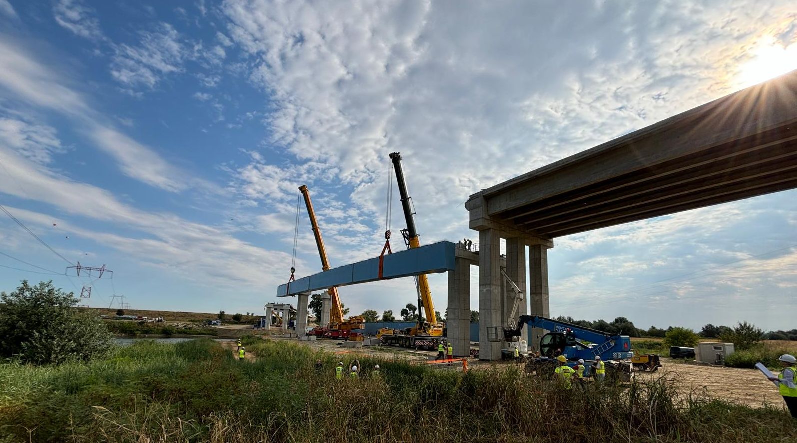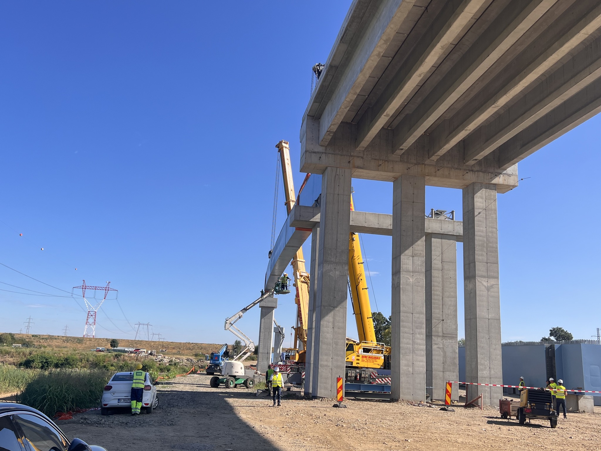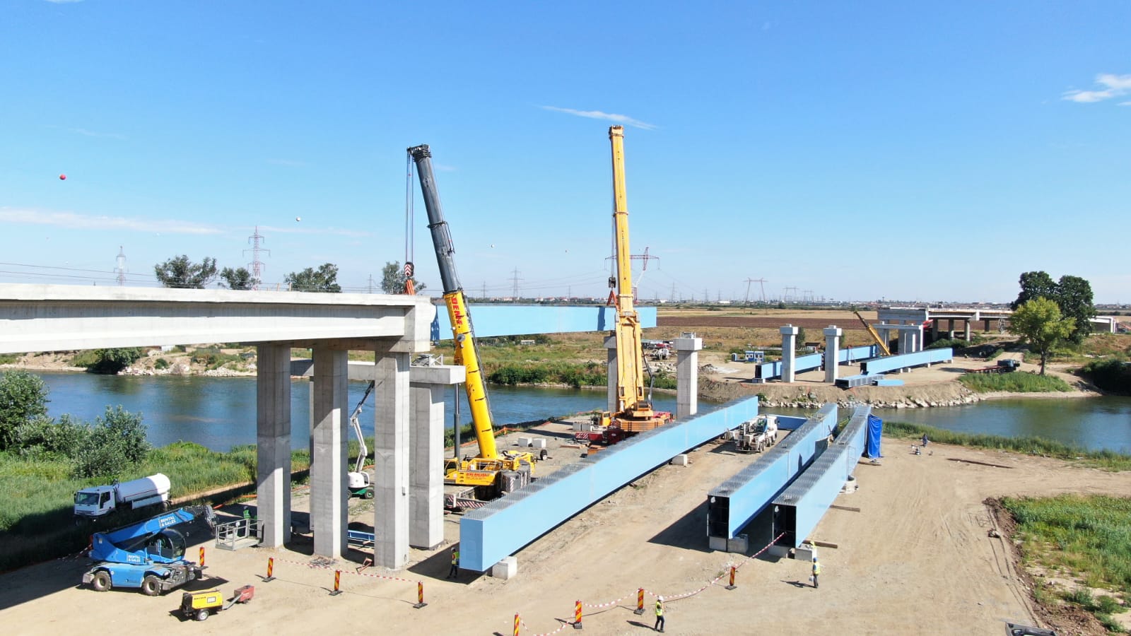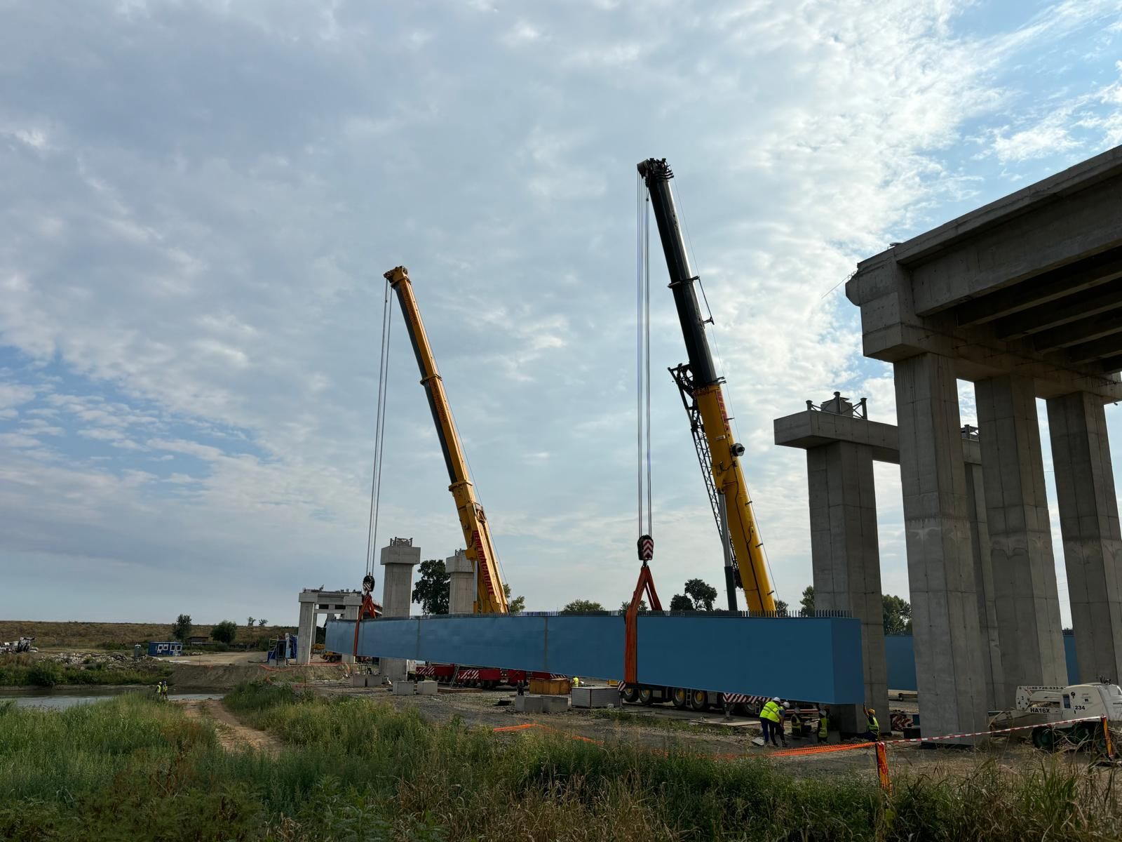 La lucrarea începută vineri au fost prezenți și reprezentanții companiei PORR, ai Direcției Regionale de Drumuri și Poduri Timiș, directori și șefi serviciu ai Consiliului Județean, implicați în proiect. Puse cap la cap, grinzile care traversează Mureșul vor avea 206 metri, adică 20 la sută din lungimea întreagă a podului.