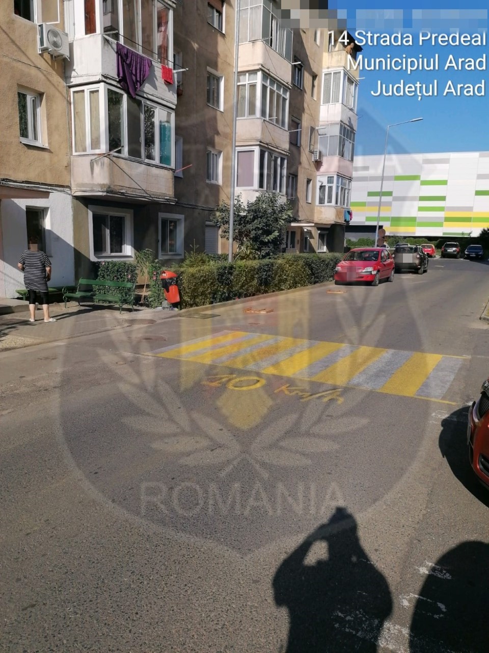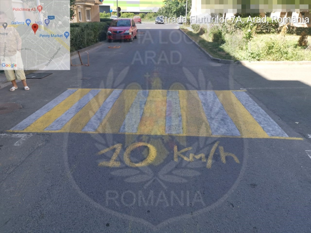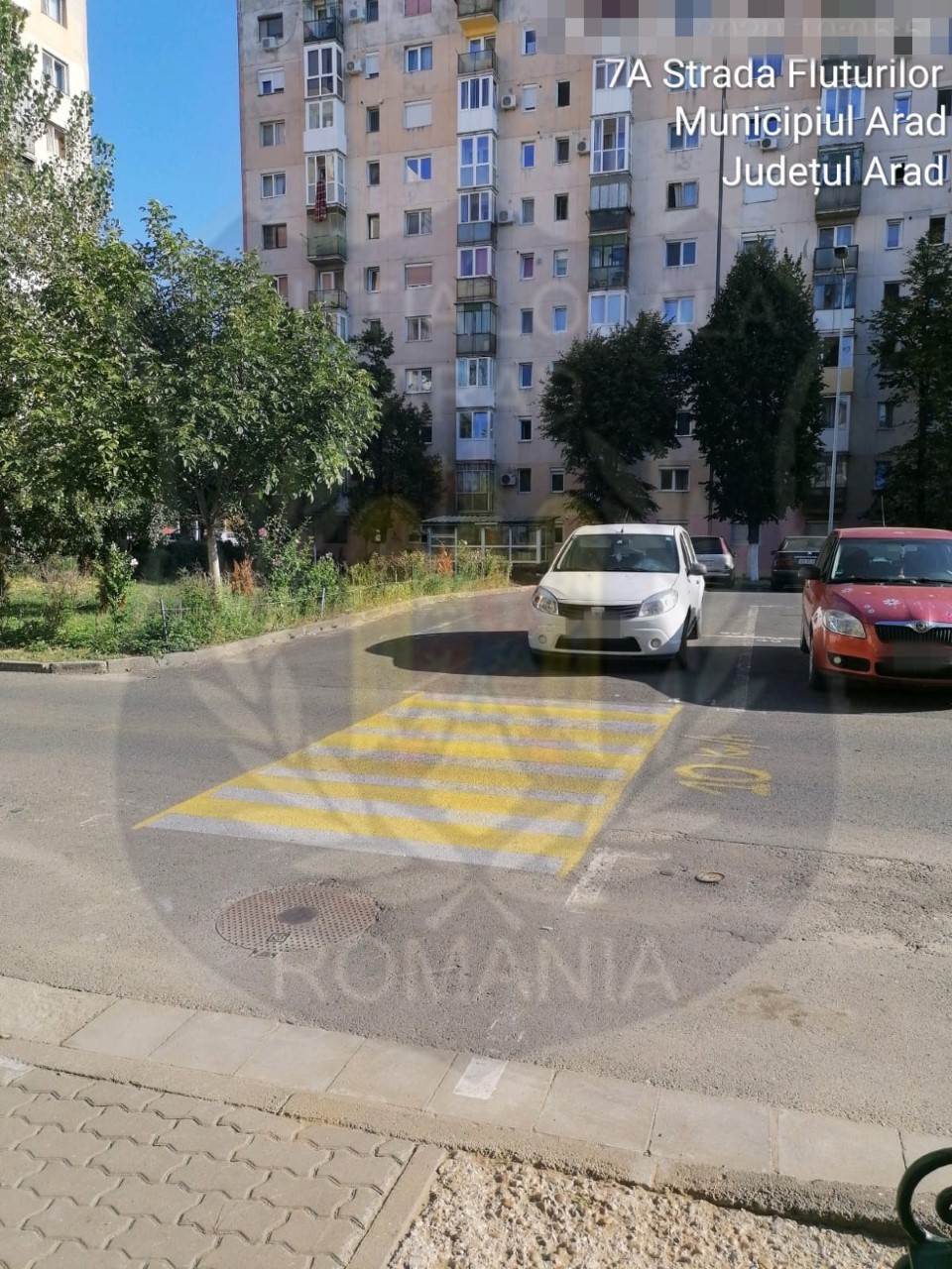 Arad. În prima decadă a lunii septembrie a.c., Direcția Generală Poliția Locală Arad a fost sesizată cu privire la “apariția” unei treceri de pietoni pe strada Fluturilor, vis-a-vis de blocul nr.7, scara D. La fața locului, un echipaj al serviciului circulație a constatat că, într-adevăr, un astfel de marcaj a fost trasat de persoane neidentificate. Speța a fost transmisă Serviciului Rutier din cadrul IPJ Arad care are competența legală de a gestiona astfel de situații, ce constituie infracțiuni (art. 399 Cod Penal alin. 1: ”Instalarea de mijloace de semnalizare rutieră sau modificarea pozițiilor acestora, fără autorizație eliberată de autoritățile competente, de natură să inducă în eroare participanții la trafic ori să îngreuneze circulația pe drumul public se pedepsește cu închisoare de la 3 luni la 2 ani sau cu amendă”).