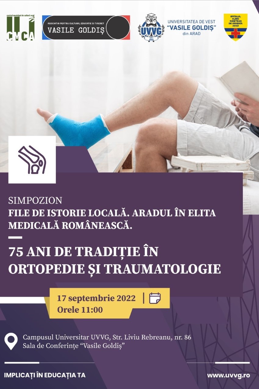 Evenimentul organizat de Universitatea de Vest „Vasile Goldiş” din Arad a reunit mai mulți specialiști din ortopedie și traumatologie, fiind un bun prilej pentru schimbul de informații și discuții despre noile tendințe de diagnosticare și tratament din domeniu. Au luat cuvântul: prof. univ. habil. dr. Coralia Cotoraci – rectorul UVVG, prof. univ. habil. dr. Alexandru Pop, director științific proiect, dr. Fruja Dan – șef lucrări, șef secție Ortopedie și Traumatologie Spitalul Județean Arad, conf. univ. dr. Casiana Boru – decanul Facultăţii de Medicină.