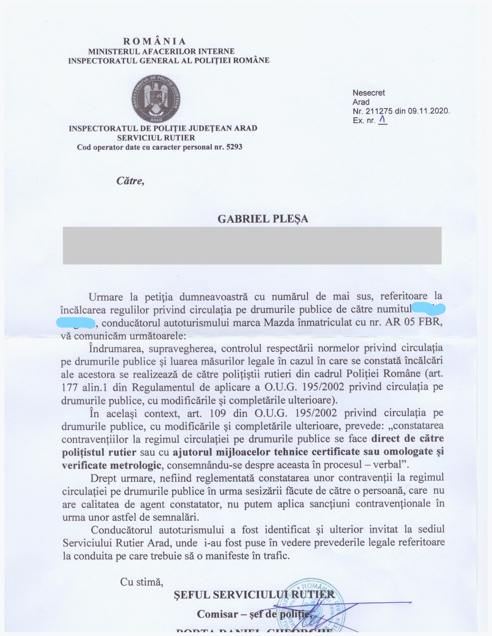 Ce îi transmite şeful Poliţiei Rutiere Arad celui care a filmat incidentul rutier? Faptul că nu are o cameră de luat vederi omologată. Şi că nici nu a fost vreun poliţist în zonă, care să constate încălcarea legii. Şi acum ne întoarcem la începutul articolului: dacă nu este vreun poliţist să te vadă, poţi să omori un om. Chiar dacă eşti filmat în timp ce o faci, camera care te surprinde nu este omologată. Dar să vedem exact răspunsul trimis de comisarul Daniel Borta arădeanului care a depus o sesizare: „Îndrumarea, supravegherea, controlul respectării normelor privind circulaţia pe drumurile publice şi luarea măsurilor legale în cazul în care se constată încălcări ale acestora se realizează de către poliţiştii rutieri din cadrul Poliţiei Române. (…) Constatarea contravenţiilor la regimul circulaţiei pe drumurile publice se face direct de către poliţistul rutier sau cu ajutorul mijloacelor tehnice certificate sau omologate şi verificate metrologic, consemnându-se despre aceasta în procesul verbal. Drept urmare, nefiind reglementată constatarea unor contravenţii la regimul circulaţiei pe drumurile publice în urma sesizării făcute de către o persoană, care nu are calitatea de agent constatator, nu putem aplica sanţiuni contravenţionale în urma unor astfel de semnalări”. Aşadar, putem să lăsăm spiritul civic deoparte. Chiar dacă ne dăm interesul şi încercăm să semnalăm nereguli Poliţiei, o vom face degeaba: nu suntem poliţişti şi, drept urmare, nu pot fi luate măsuri împotriva celor care încalcă legea. Totuşi, sub propria semnătură, şeful Poliţiei Rutiere Arad anunţă că şoferul prins pe cameră a fost chemat la Poliţie şi a fost înştiinţat că trebuie să respecte legea, de acum înainte.