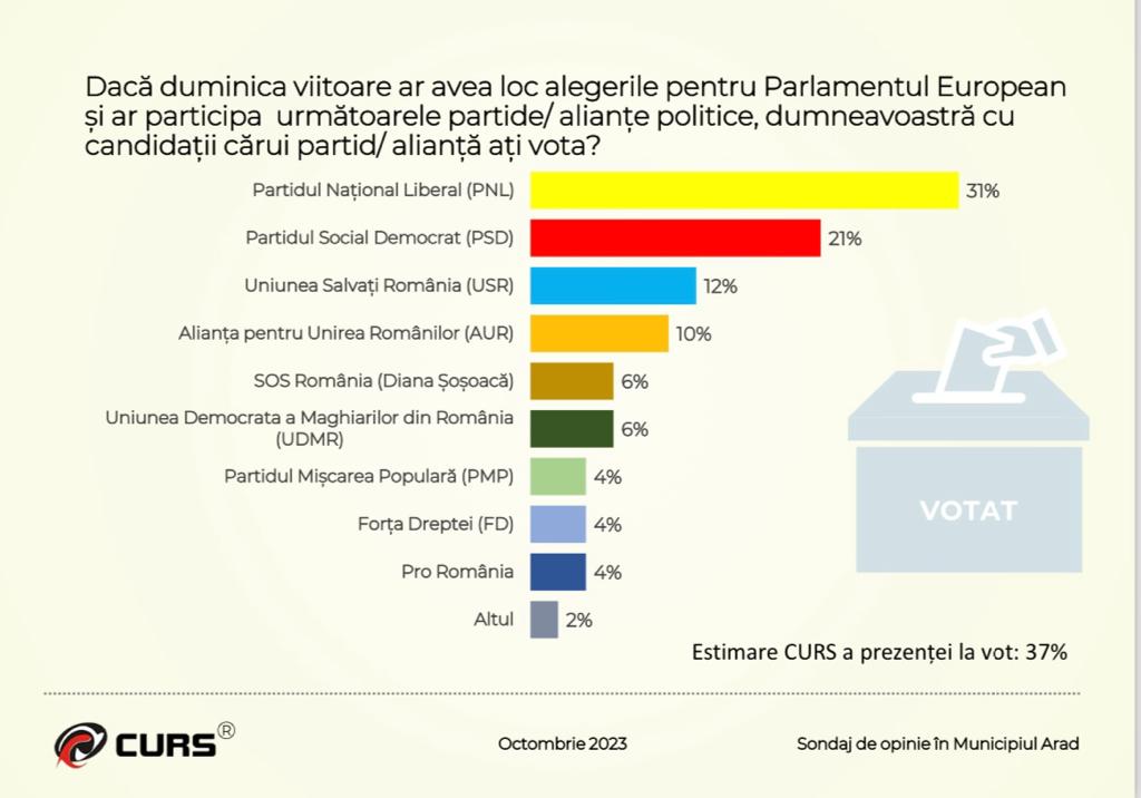 Chiar dacă partidele politice nu ar dori mediatizarea, suntem din nou în măsură să vă prezentăm rezultatele celui mai nou sondaj. Dacă duminica viitoare ar avea loc alegeri pentru Parlamentul European și ar participa următoarele partide/alianțe politice, dumneavoastră cu candidații cărui partid/alianță ați vota? Aceasta este prima întrebare, europarlamentarele fiind primele alegeri de anul viitor. Partidul Național Liberal conduce detașat cu 31% intenție de vot în rândul celor sondați, urmat la 10 procente de Partidul Social Democrat. Surprinzător, poate, a treia poziție este ocupată de Uniunea Salvați România cu 12%, la mică distanță, cu 10% situându-se Alianța pentru Unirea Românilor. Locurile 5 și 6 sunt ocupate, la egalitate cu 6%, de către SOS România și Uniunea Democrată a Maghiarilor din România. Dintre cei chestionați 35% s-ar prezenta în mod sigur la vot la aceste alegeri.