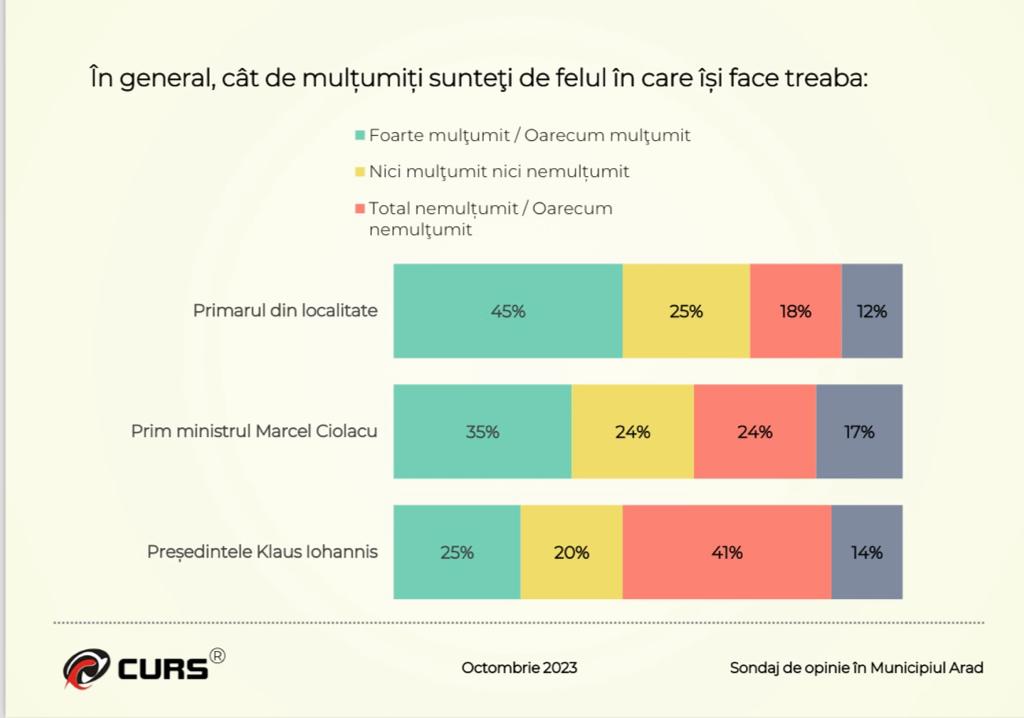 Personalitățile aflate în funcții publice atrag întotdeauna atenția, poate de aceea următoarea întrebare: În general, cât de mulțumiți sunteți de felul în care își face treaba? 25% dintre respondenți sunt mulțumiți de munca lui Klaus Iohannis, Președintele României, 35% sunt mulțumiți de munca lui Marcel Ciolacu, Premierul României, iar 45% sunt mulțumiți de munca depusă de Călin Bibarț, primarul Aradului.