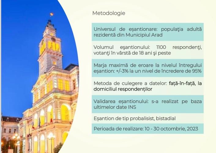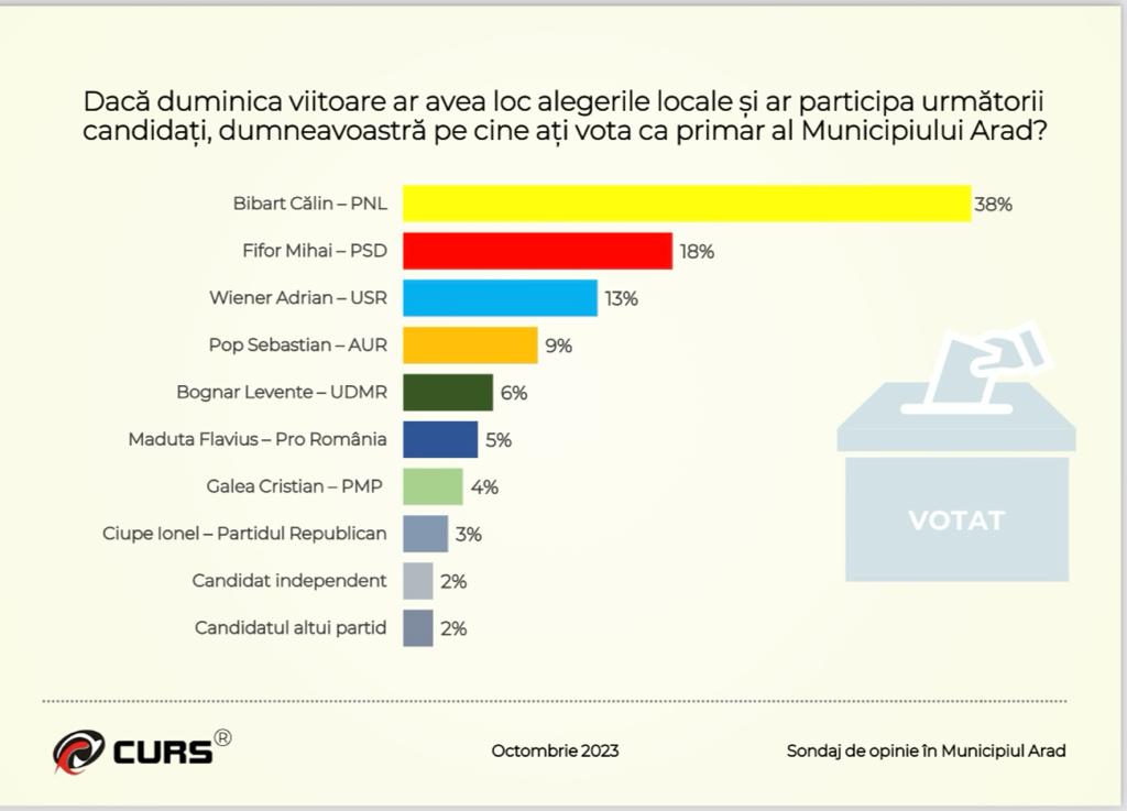 Desigur, sondajul are mai multe întrebări, dar probabil ultima care să ne intereseze pe noi, arădenii este: Dacă duminica viitoare ar avea loc alegerile locale și ar participa următorii candidați, dumneavoastră pe cine ați vota ca primar al Municipiului Arad? Așa cum era de așteptat, Călin Bibarț, candidând din partea PNL se află pe prima poziție cu 38%, în ușoară creștere față de ultimul sondaj. Pe locul 2, cu 18% din preferințele arădenilor, se află Mihai Fifor, PSD, care este cu 5 procente în fața lui Adrian Wiener, candidat al USR. Sebastian Pop, reprezentant AUR, cu 9% și Levente Bognar, UDMR, cu 6%, sunt următorii pe această listă.