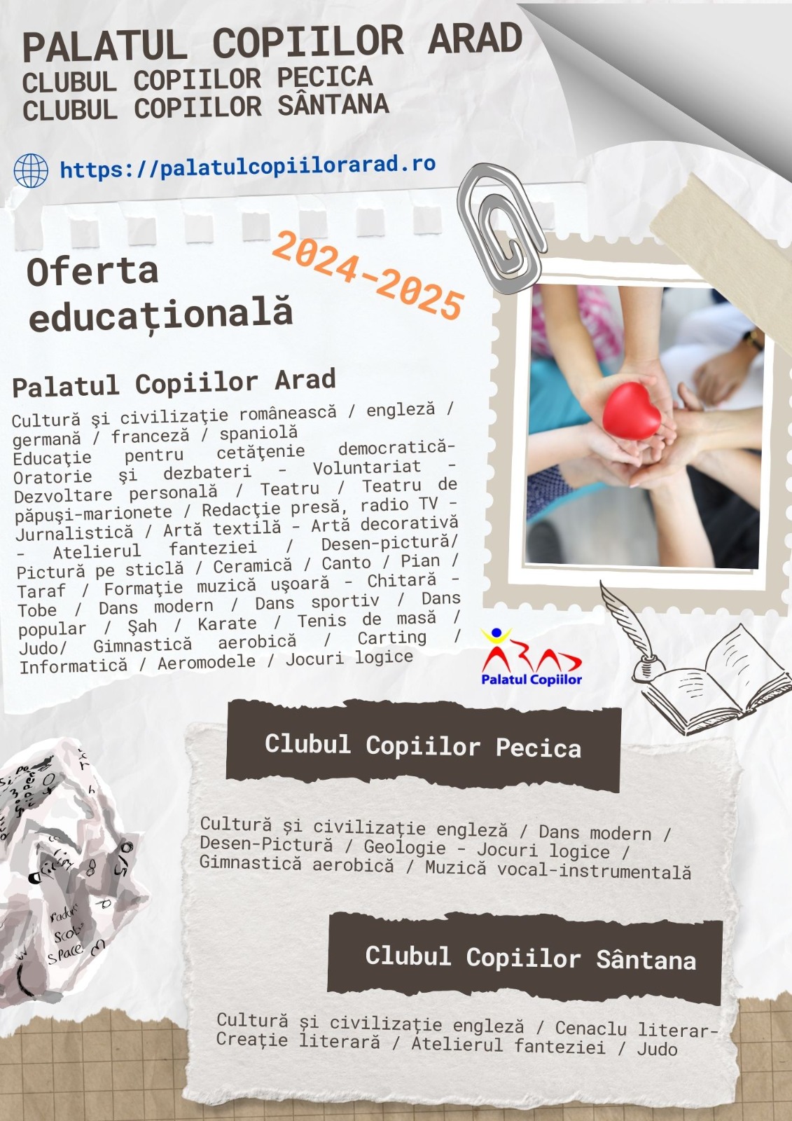 De la cultură și civilizație românească, engleză, germană sau spaniolă, teatru, teatru de păpuși sau jurnalism, până la carting, aeromodelism, jocuri logice sau informatică – toate pot fi învățate sau dezvoltate de copiii și tinerii din Arad la Clubul Copiilor. Instituția a anunțat că a dat startul înscrierilor, între 20 mai și 30 iunie fiind așteptate cererile copiilor sau elevilor care nu au mai frecventat cursurile din cadrul Palatului Copiilor Arad în acest an școlar, dar doresc să le frecventeze în anul următor.