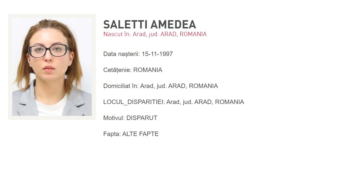 Saletti Amedea are 28 de ani, este din Arad, are păr șaten, înălțime de 1,7m și ochi căprui. Potrivit apropiaților ultima dată a fost văzută sâmbătă, 4 aprilie, în jurul orei 14:00 în zona Boul Roșu.