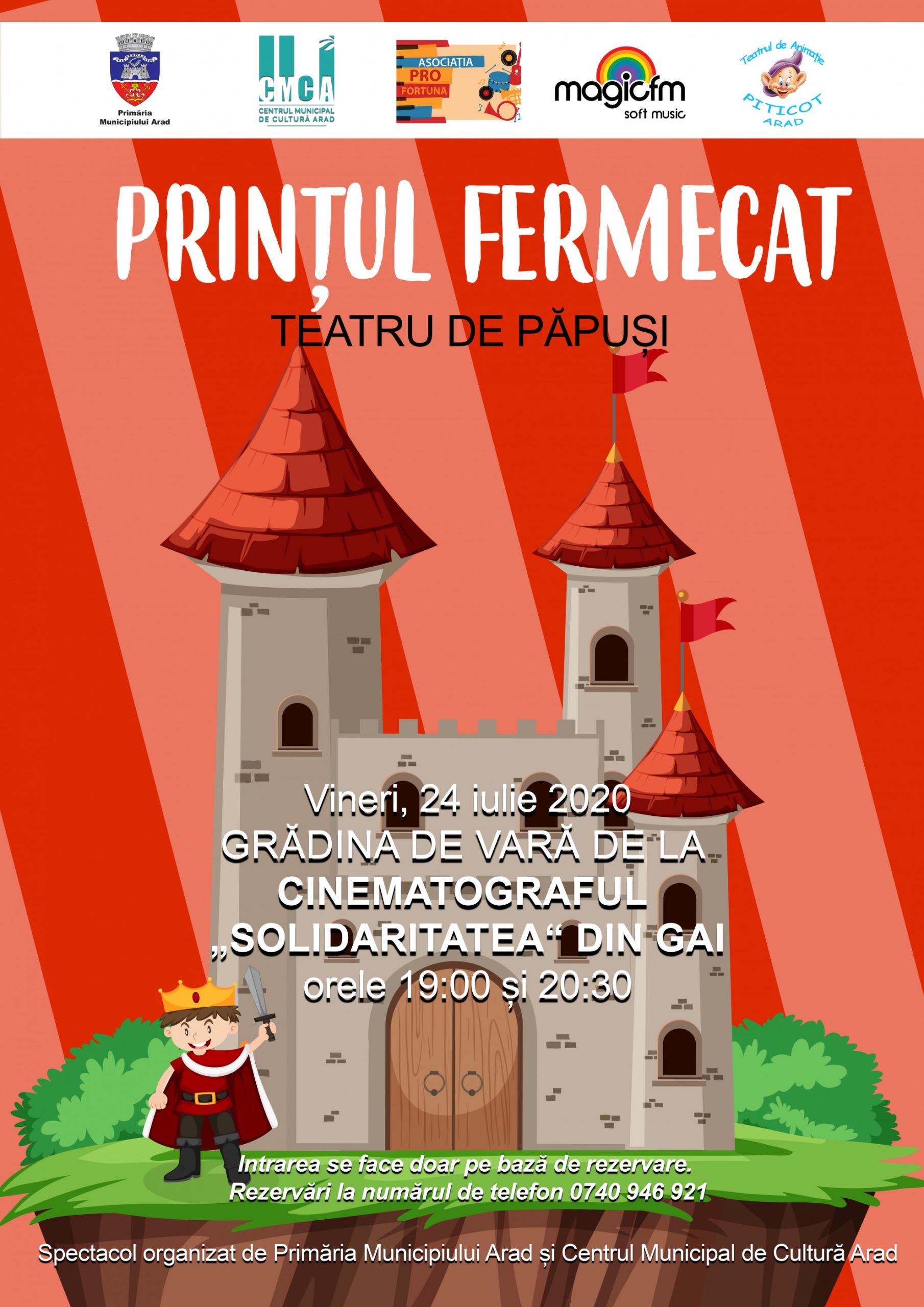 Cei mai tineri găieni vor avea ocazia să urmărească vineri, 24 iulie, de la ora 19, în grădina de vară a cinematografului de cartier, spectacolul „Prințul fermecat”. Spectacol muzical antrenant, adaptat după povestea Fraților Grimm și pus în scenă de Teatrul de Animație „Piticot” Arad, „Prințul Fermecat” spune povestea unui prinț lăudăros, care face promisiuni dar nu le respectă și drept pedeapsă este transformat de vrăjitoare în broscoi. Vraja o poate rupe doar o prințesă care îl va iubi cu adevărat, sub această înfățișare. După câteva încercări își va recăpăta chipul adevărat. Povestea ne învață că atunci când facem promisiuni trebuie neapărat să le respectăm, sau dacă știm că nu le putem îndeplini, mai bine să nu promitem.