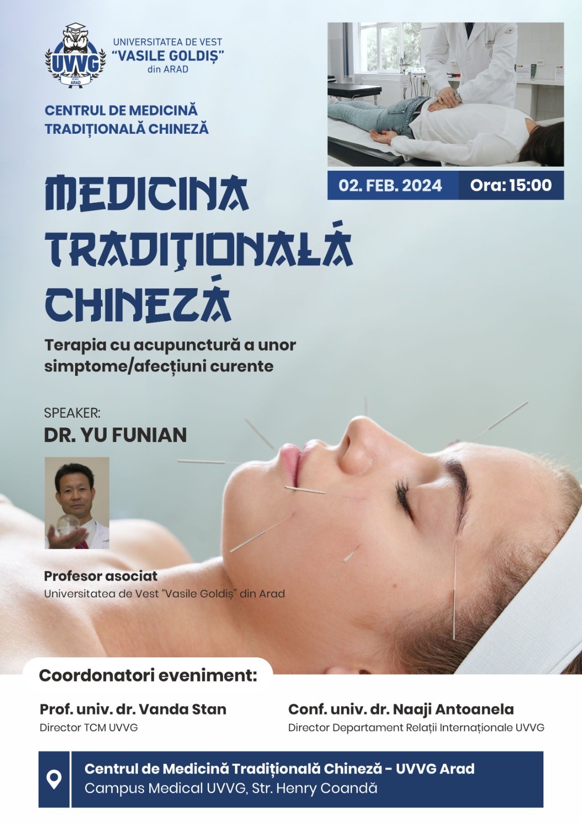 Coordonatorii evenimentului sunt prof. univ. Dr. Vanda Stan, director TCM UVVG și conf. univ. dr. Antoanela Naaji, director Relații internaționale, iar invitat și speaker va fi dr. Yu Funian, președinte al Asociației Internaționale de Medicină Tradițională Chineză și membru de onoare al Federației Mondiale a Societăților de Medicină Tradiţională Chineză.