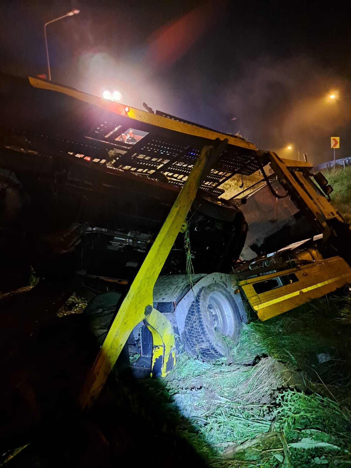 UPDATE. TIR încărcat cu mașini, răsturnat la ieșirea de pe autostradă. Șoferul a decedat