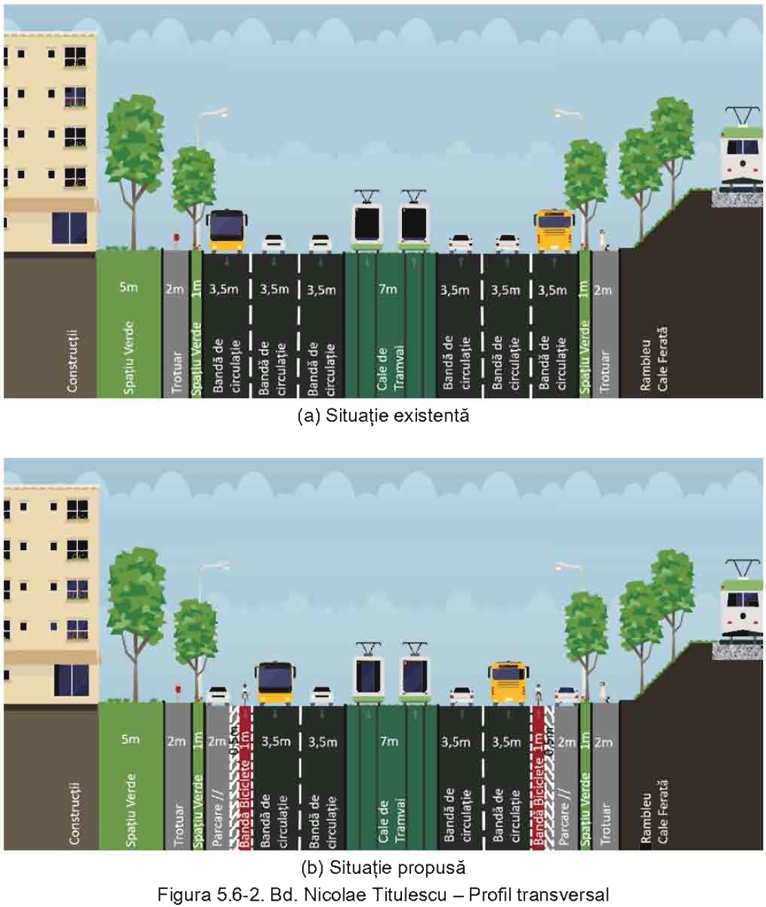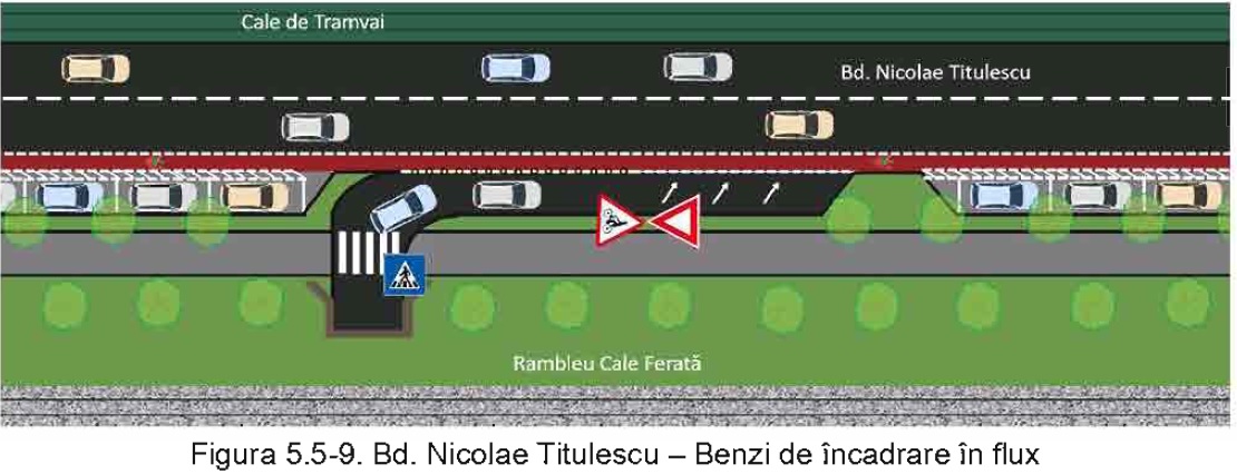 Pe Bulevardul Nicolae Titulesc nu se recomandă semaforizarea de noi intersecţii, însă sunt propuse amenajări ale intersecţiilor cu subtraversările de cale ferată al căror sens de circulaţie este spre Bulevardul Nicolae Titulescu, „deoarece în configuraţia actuală acestea presupun plecări din rampă şi o vizibilitate slabă a vehiculelor de pe drumul principal şi a pietonilor. Astfel, se propune ca pe distanţe de 50 de metri să fie amenajate benzi de încadrare în flux. Benzile de încadrare vor fi amenajate pe banda 1 existentă pe care s-a propus amenajarea de locuri de parcare laterală şi vor oferi o mai bună vizibilitate a vehiculelor care circulă pe drumul cu prioritate, punând totodată la dispoziţie spaţiu de stocare pentru aşteptarea încadrării în flux.”