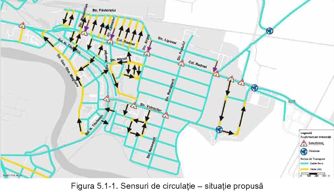 „Pentru străzile situate la nord de Calea Radnei se propun următoarele intervenţii în organizarea sensurilor de circulaţie: străzile Dosoftei, Maximilian, Lalelelor, Argeş şi Constanţa – sens unic dinspre strada Păstorului spre Calea Radnei; străzile Păstorului, Lipovei, Prutului, Liliac şi Adrian – circulaţie în dublu sens; restul străzilor – sens unic dinspre Calea Radnei spre strada Păstorului. În zona 100-200 se propun următoarele intervenţii în organizarea sensurilor de circulaţie: strada Abrud, tronson estic – sens unic dinspre Păşunii spre Mioriţa; străzile Severin, Imaşului (între Simion Popa şi Caius Lepa) – sens unic dinspre Calea Radnei spre Caius Lepa; străzile Bârzava, Prieteniei (între Simion Popa şi Caius Lepa) şi Semănătorilor (între Simion Popa şi Caius Lepa) – sens unic dinspre Caius Lepa spre Radnei; strada Stânjenel – sens unic dinspre Păşunii spre Săvârşin; străzile Fluierului şi Gherghiţei – sens unic dinspre Abrud spre Stânjenel; strada Busuioc – sens unic dinspre Stânjenel spre Abrud. În zona 500-700: străzile Zalău şi Beiuş – sens unic dinspre Voinicilor spre Sighişoara.”