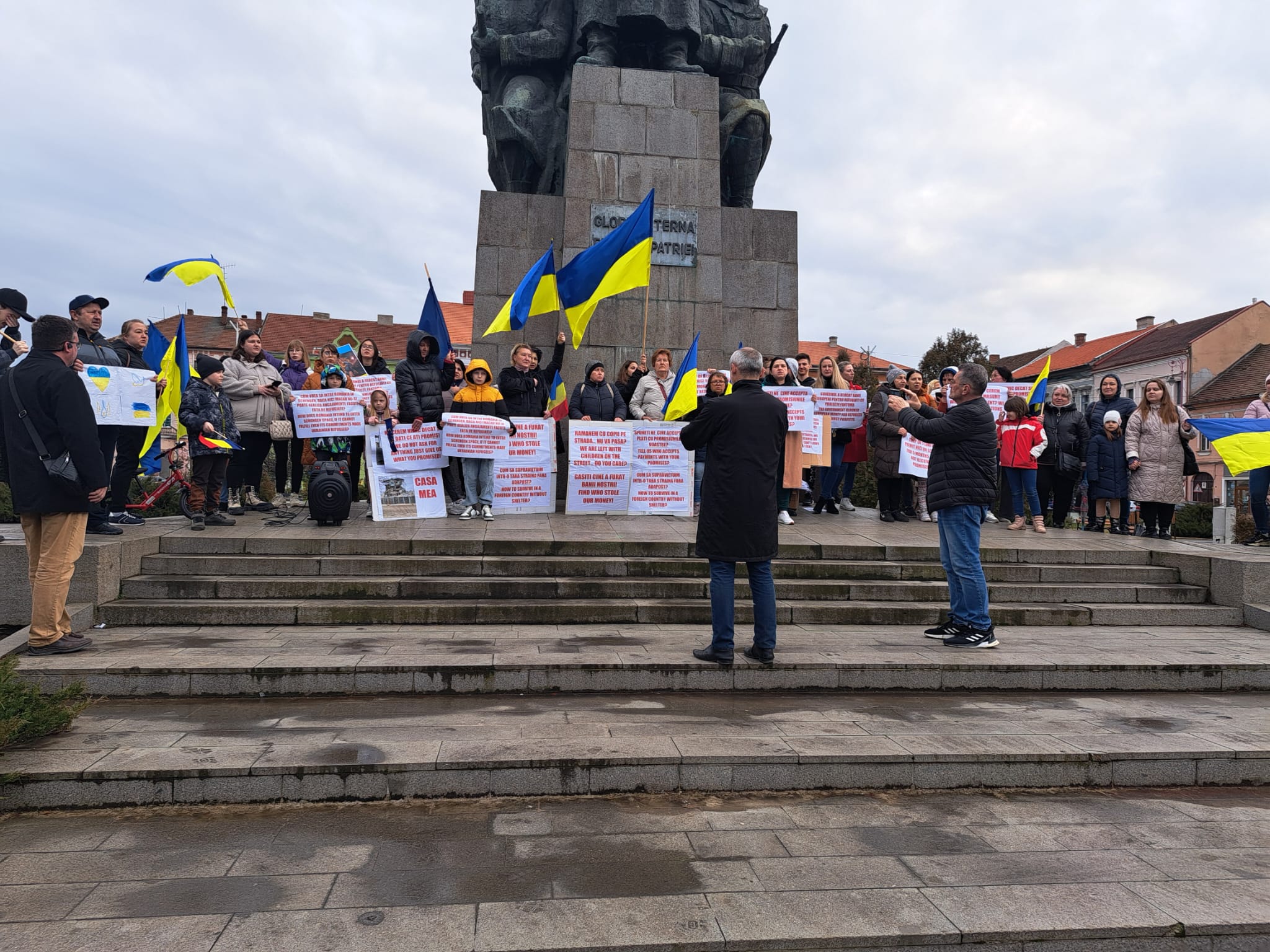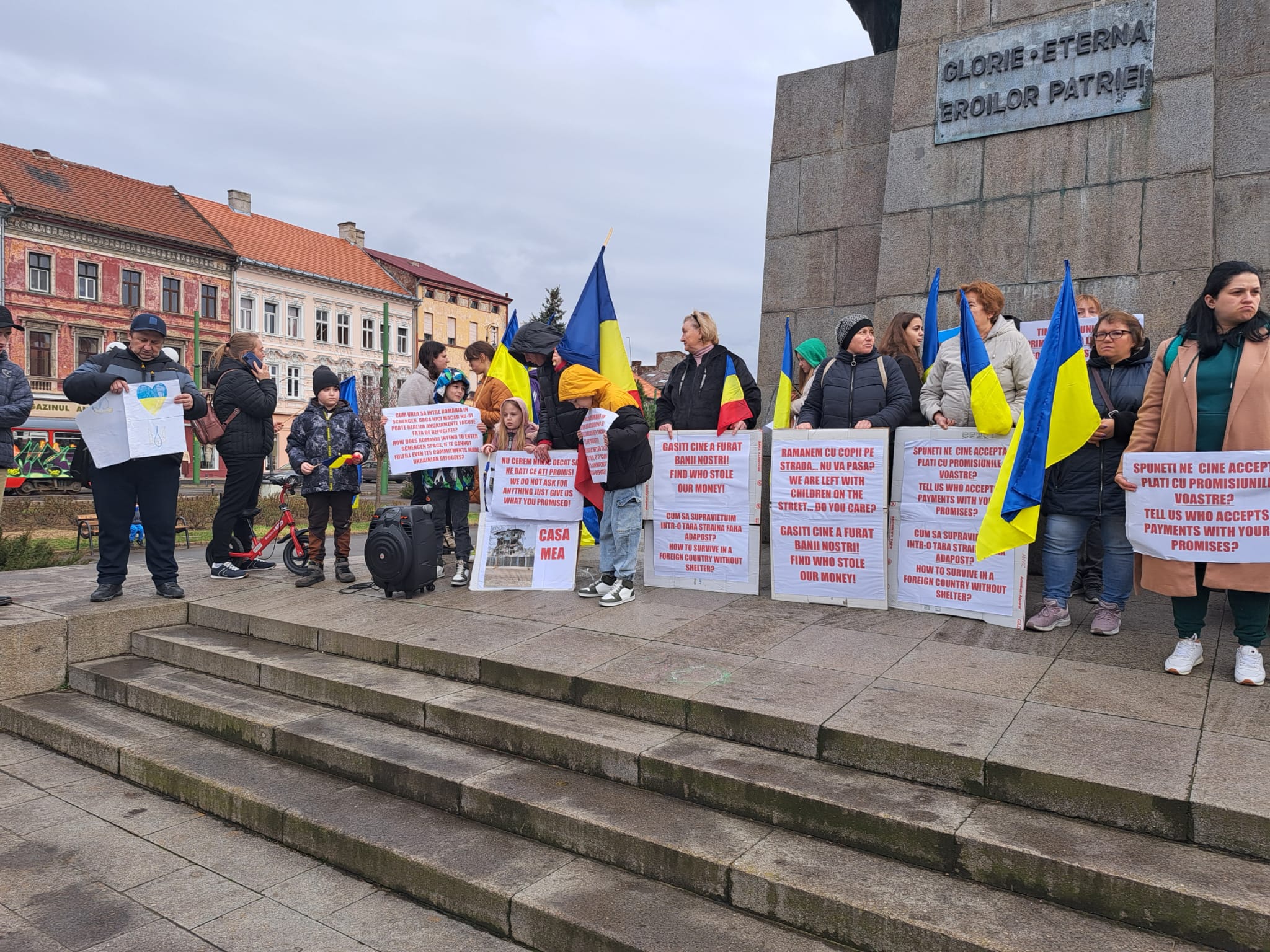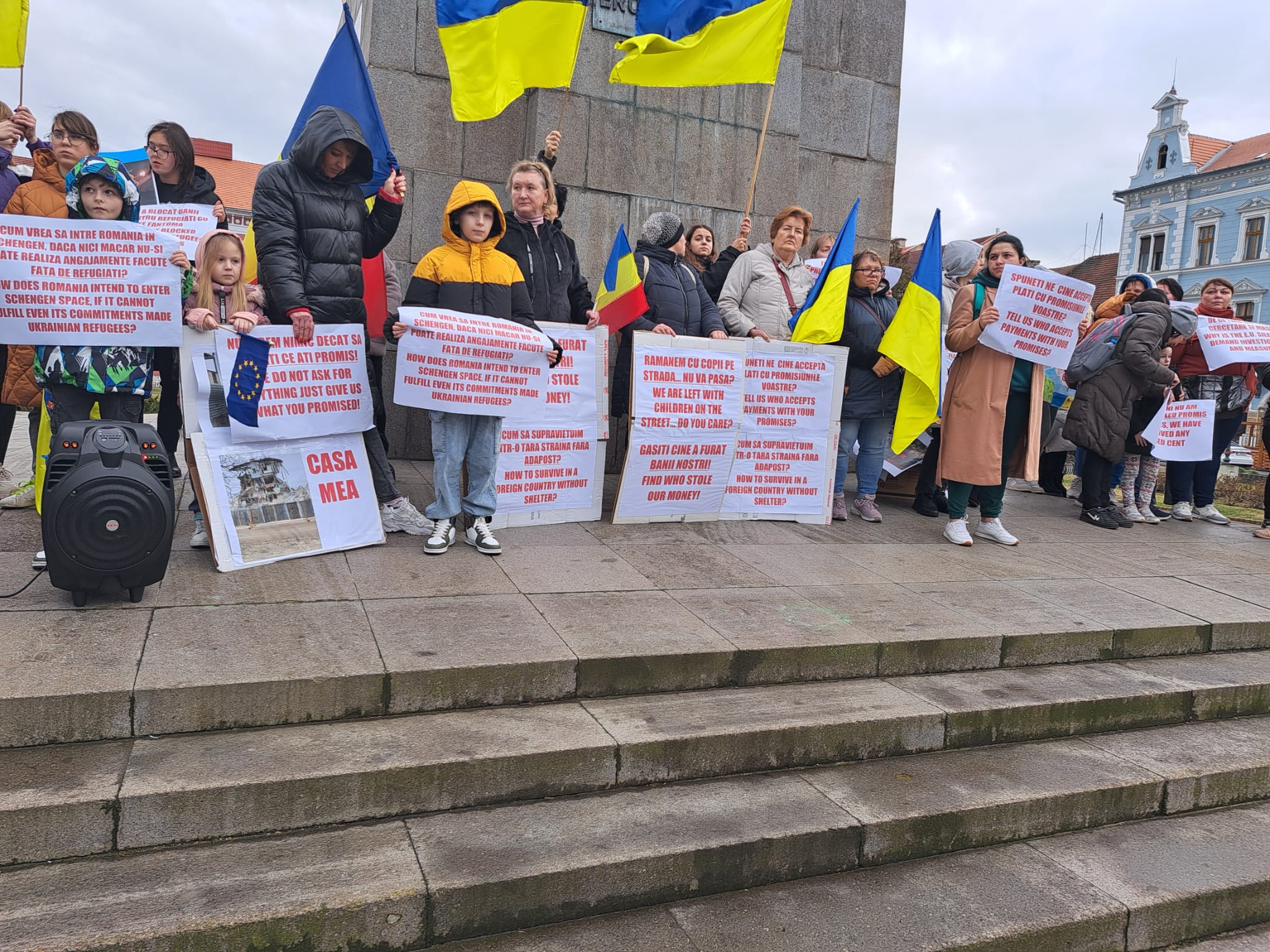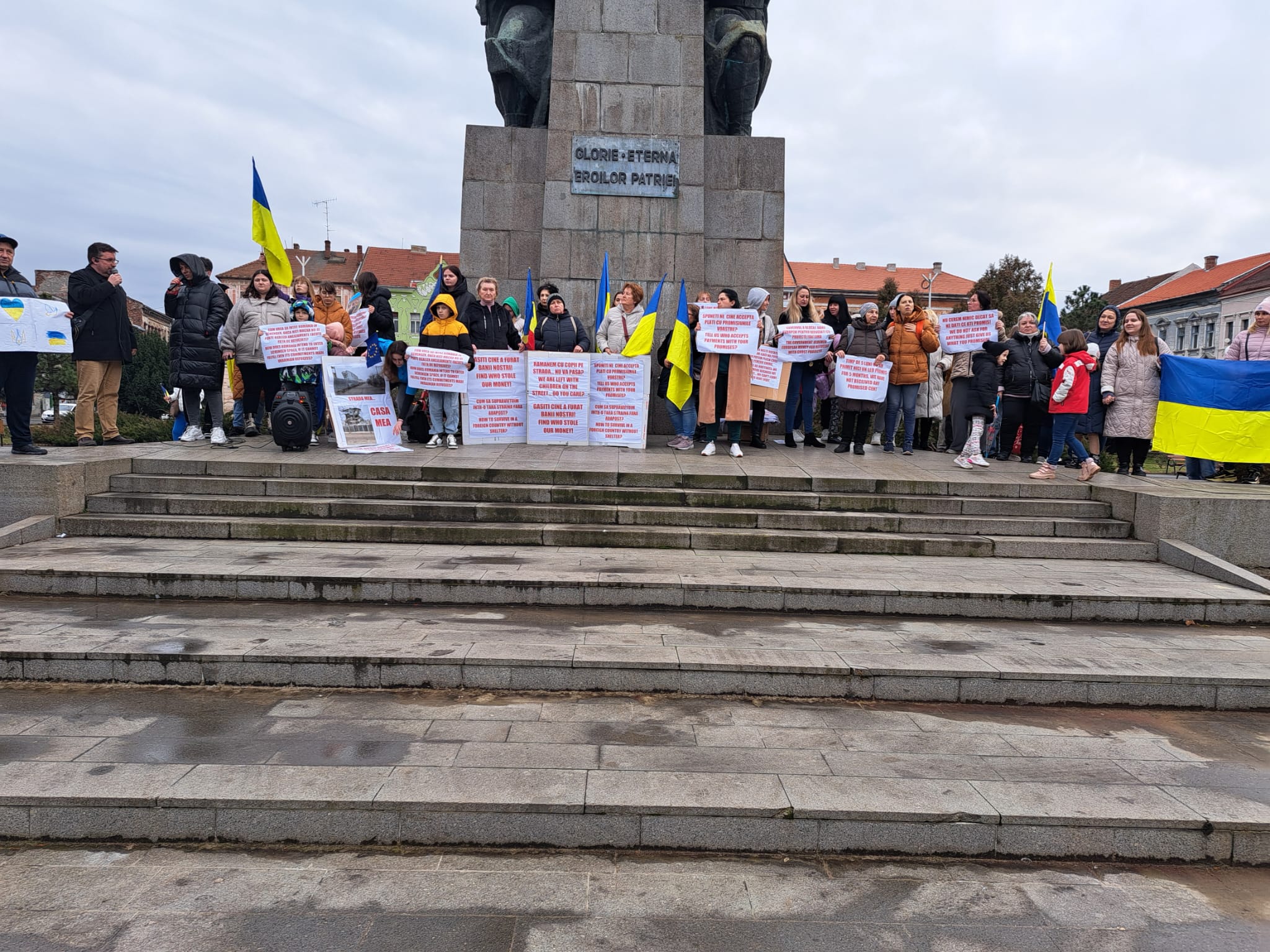 Mitingul a început cu intonarea Imnului Național al Ucrainei. Aproximativ 50 de persoane, în special mame și copii de toate vârstele, au participat la protest având în mâini steaguri ale Ucrainei, ale României și ale Uniunii Europene, dar și pancarde prin care acuză faptul că banii le ar fi fost furați, că sunt ostateci în România în condițiile în care nu au bani să iși plătească chiriile, dar nici să plece pentru că au datorii pentru chirii. Unii dintre ei spun că au rămas în România tocmai pentru faptul că statul le a promis ajutoare financiare pentru cazare.
