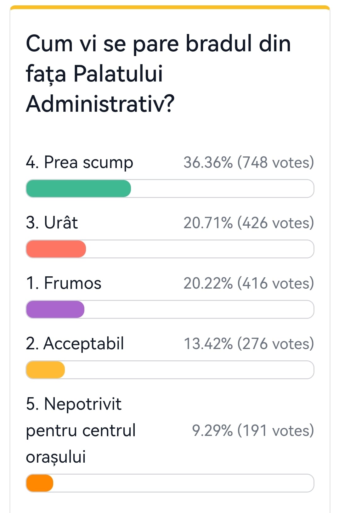 Pentru a lua pulsul cititorilor www.aradon.ro pe un subiect îndelung disputat pe rețelele de socializare, am făcut un sondaj online, timp de două zile, la care au răspuns 2.057 de arădeni. 748 dintre cei care au votat, adică 36,36 la sută, au decis că bradul este mult prea scump. 426 de votanți – 20,71 la sută – au considerat că bradul este urât, iar 416 respondenți – 20,22 la sută – spun că bradul este frumos. Pomul de Crăciun din fața Palatului Administrativ este unul acceptabil pentru 276 de respondenți, adică 13,42 la sută. 191 de arădeni – 9,29 la sută dintre respondenți – consideră că bradul este nepotrivit pentru centrul municipiului.
