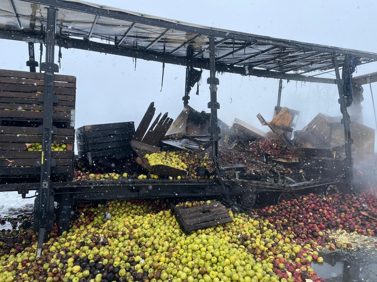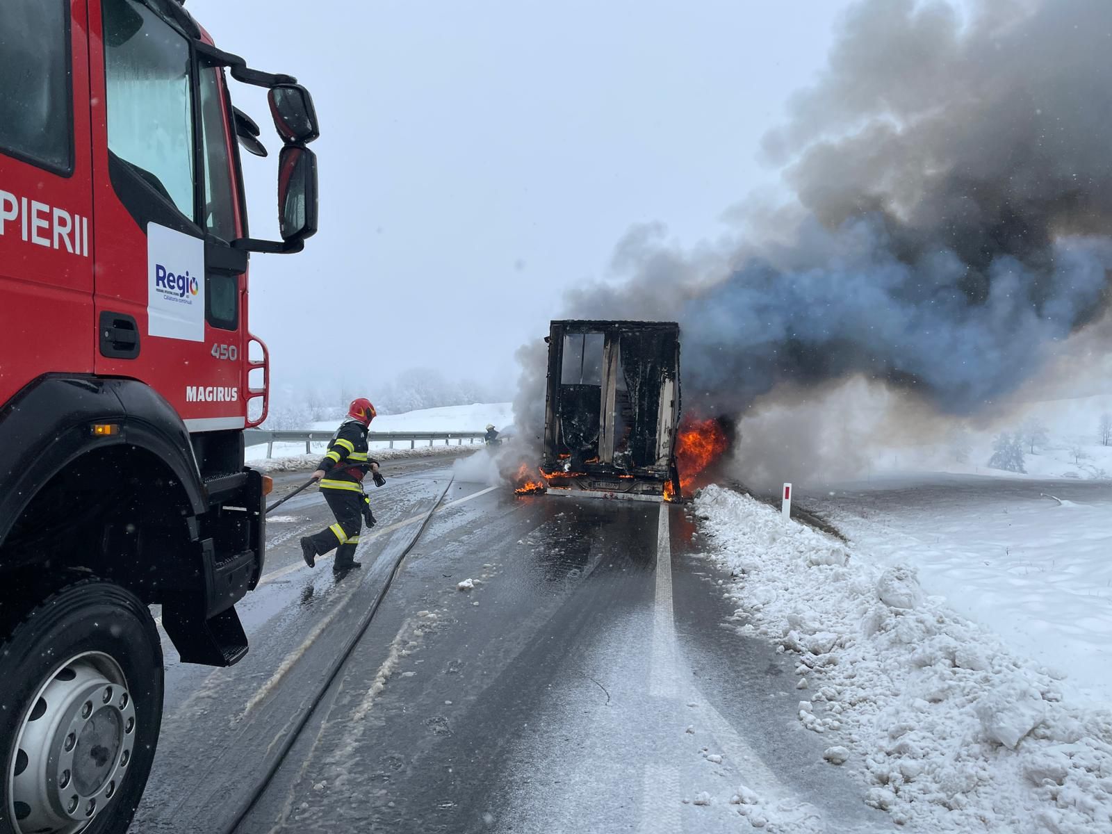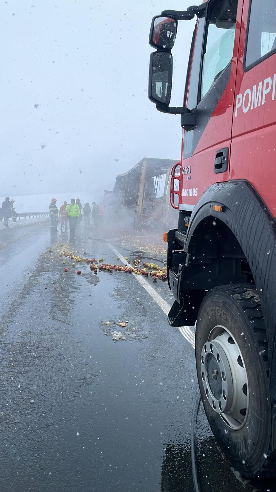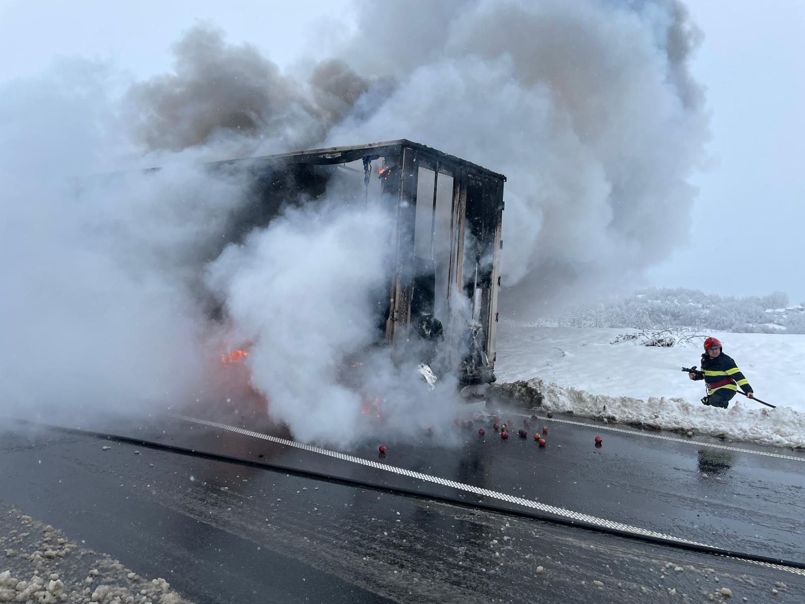 ARAD. „În această dimineaţă, în jurul orei 08:15, pompierii militari ai Detașamentului Sebiș – Garda 2 Gurahonț au fost solicitaţi să intervină pentru localizare şi stingerea unui incendiu, izbucnit la remorca unui autocamion, între localitățile Brad și Vârfurile. La faţa locului a fost mobilizată o autospecială de stingere cu apă şi spumă, un echipaj SMURD şi pompierii voluntari ai SVSU Hălmagiu. La sosirea echipajelor incendiul se manifesta la remorca autocamionului, care era încărcată cu mere. În urma intervenţiei pompierilor, a fost salvat capul tractor, însă remorca a fost afectată în totalitate. În aceste momente, pompierii arădeni acționează pentru îndepărtarea efectelor negative ale incendiului. Nu au fost înregistrate victime”, au anunțat reprezentanții ISU Arad.