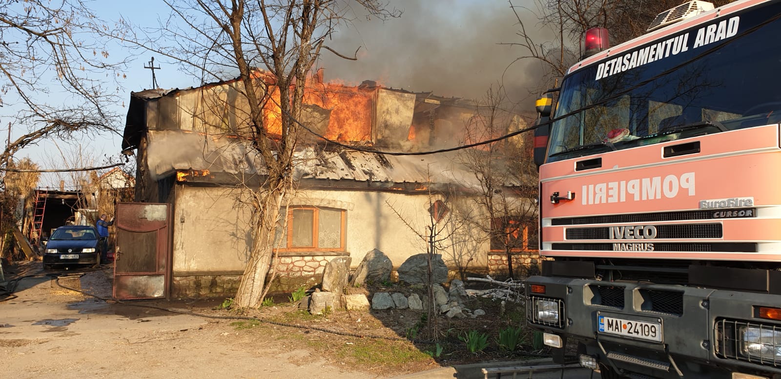 UPDATE 3: Pompierii au stabilit cauza probabilă a incendiului ca fiind „jar sau scântei de la un coș de fum care prezenta deteriorări”. Incendiul a fost stins după aproximativ 4 ore. Potrivit ISU Arad, în incendiu a ars o casă compusă din mai multe camere și anexe și s-a deteriorat o porțiune a acoperișului casei învecinate care era lipită de imobilul care a luat foc.