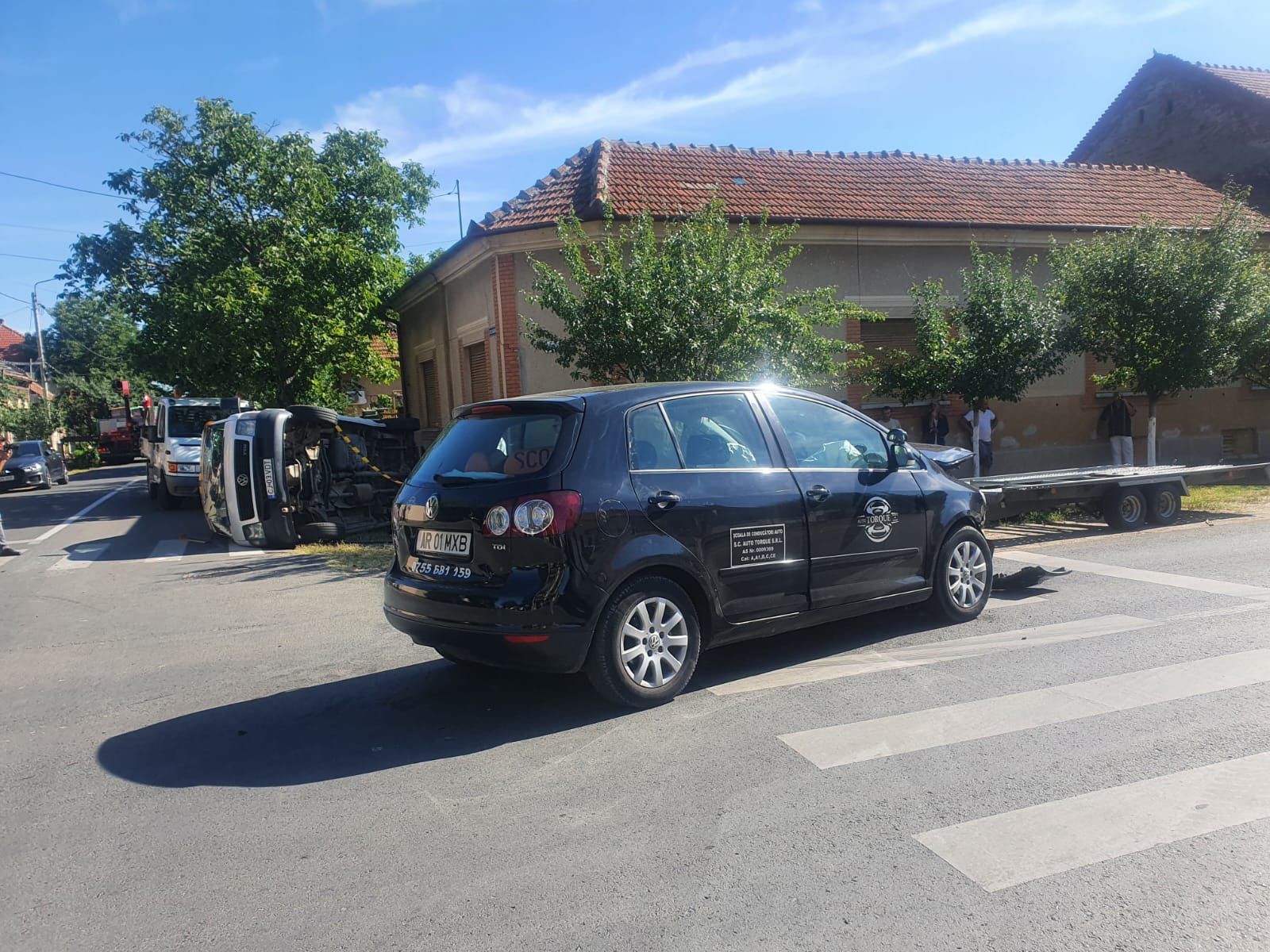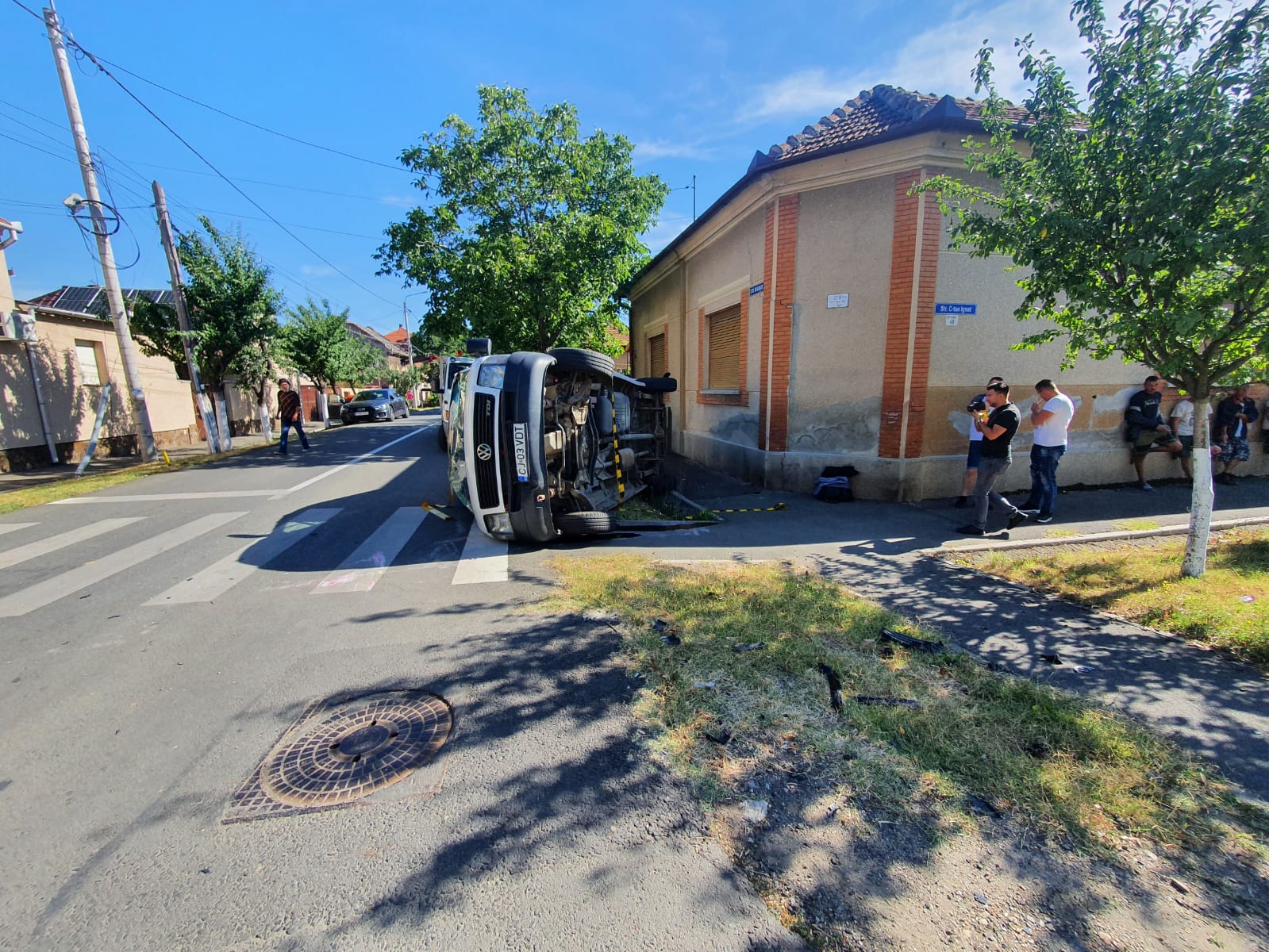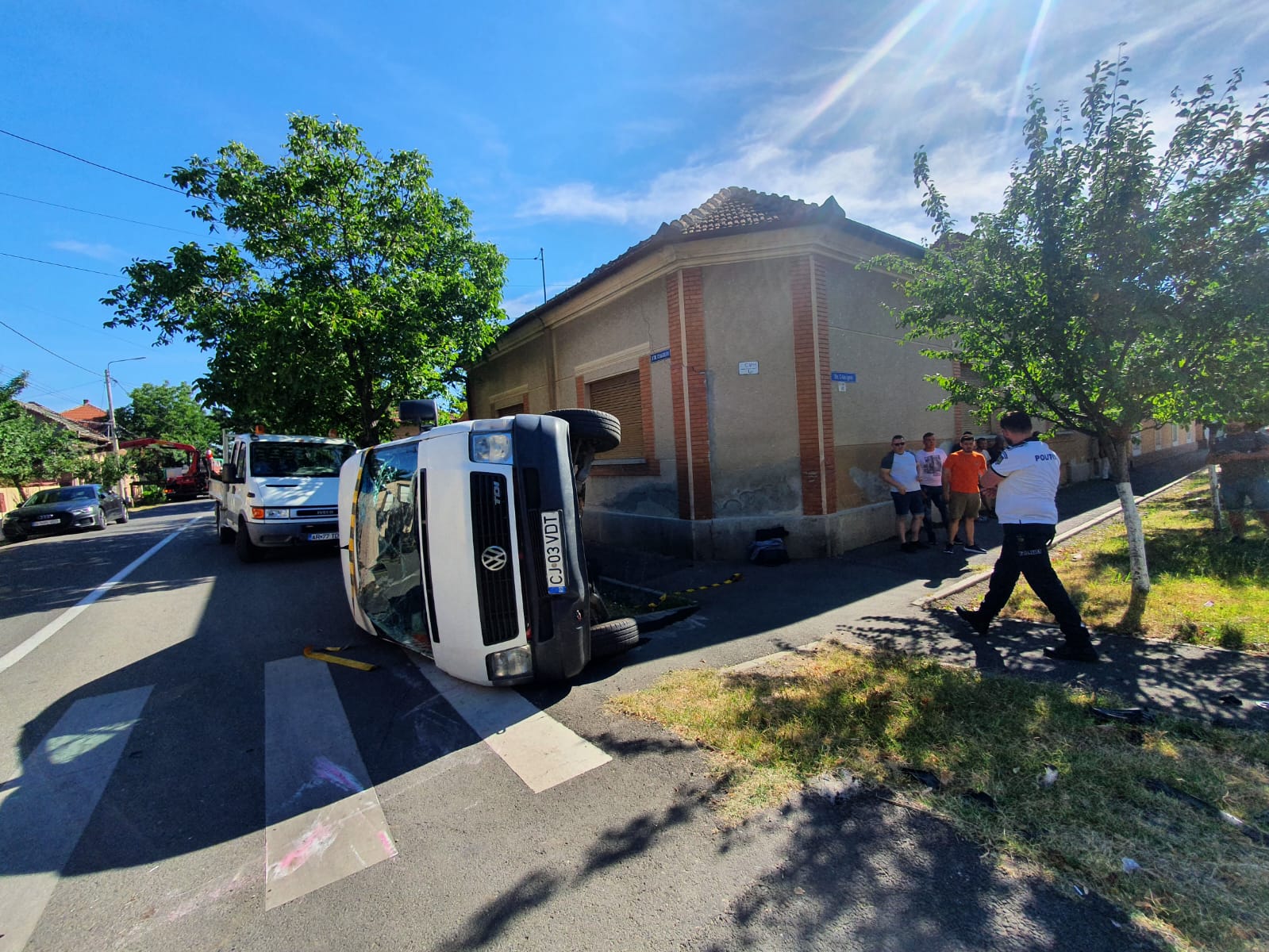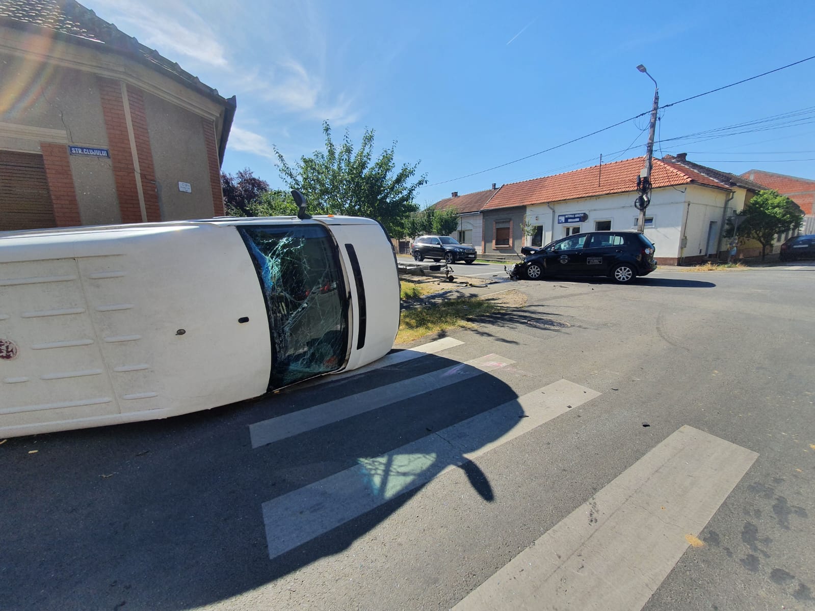 ARAD. Potrivit primelor informații primite de la fața locului, microbuzul nu ar fi acordat prioritate de trecere, intrând în coliziune cu autoturismul. În urma impactului, microbuzul s-a răsturnat pe o parte. O persoană a fost transportată la spital pentru evaluare, în urma evenimentului rutier.