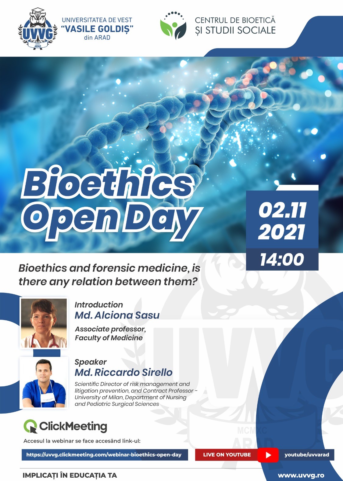 „Continuăm seria Open Day-urilor, o iniţiativă foarte apreciată de studenţi şi cadrele didactice, precum şi a conferinţelor susţinute de Centrul de Bioetică UVVG, aflat sub egida Universităţii din Padova, cu participarea unor specialişti de renume. Toate acestea au darul de a îmbogăţi orizontul participanţilor, temele abordate fiind de actualitate” – spune prof. univ. dr. Coralia Adina Cotoraci, rectorul Universităţii de Vest „Vasile Goldiş” din Arad.