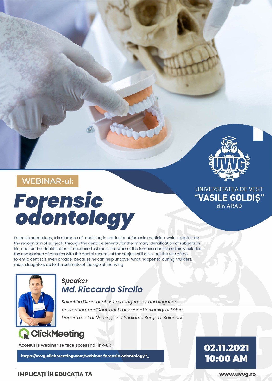 În primul webinar, Riccardo Sirello a susţinut o prelegere cu tema Odontologia Medico-legală, în care a dezvoltat utilitatea acestei supraspecializări în domeniul medical şi medico-legal, cu descrierea metodelor prin care se realizează profilul dentar, recunoaşterea unui individ pe seama acestuia şi, nu în ultimul rând, aspectele etice relevante în folosirea acestor tehnici.