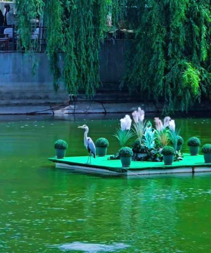 Insuliţa artificială a fost realizată de administraţia locală în luna februarie, pentru a le permite raţelor sălbatice care vin anual pe lac să cuibărească, în condiţiile în care malurile sunt din beton şi cu băncuţe pentru vizitatori. Nicio raţă nu s-a instalat pe mica insulă, însă locul a intrat sub stăpânirea unui stârc cenuşiu, care cel mai probabil a găsit punctul ideal din care poate vâna peşti.