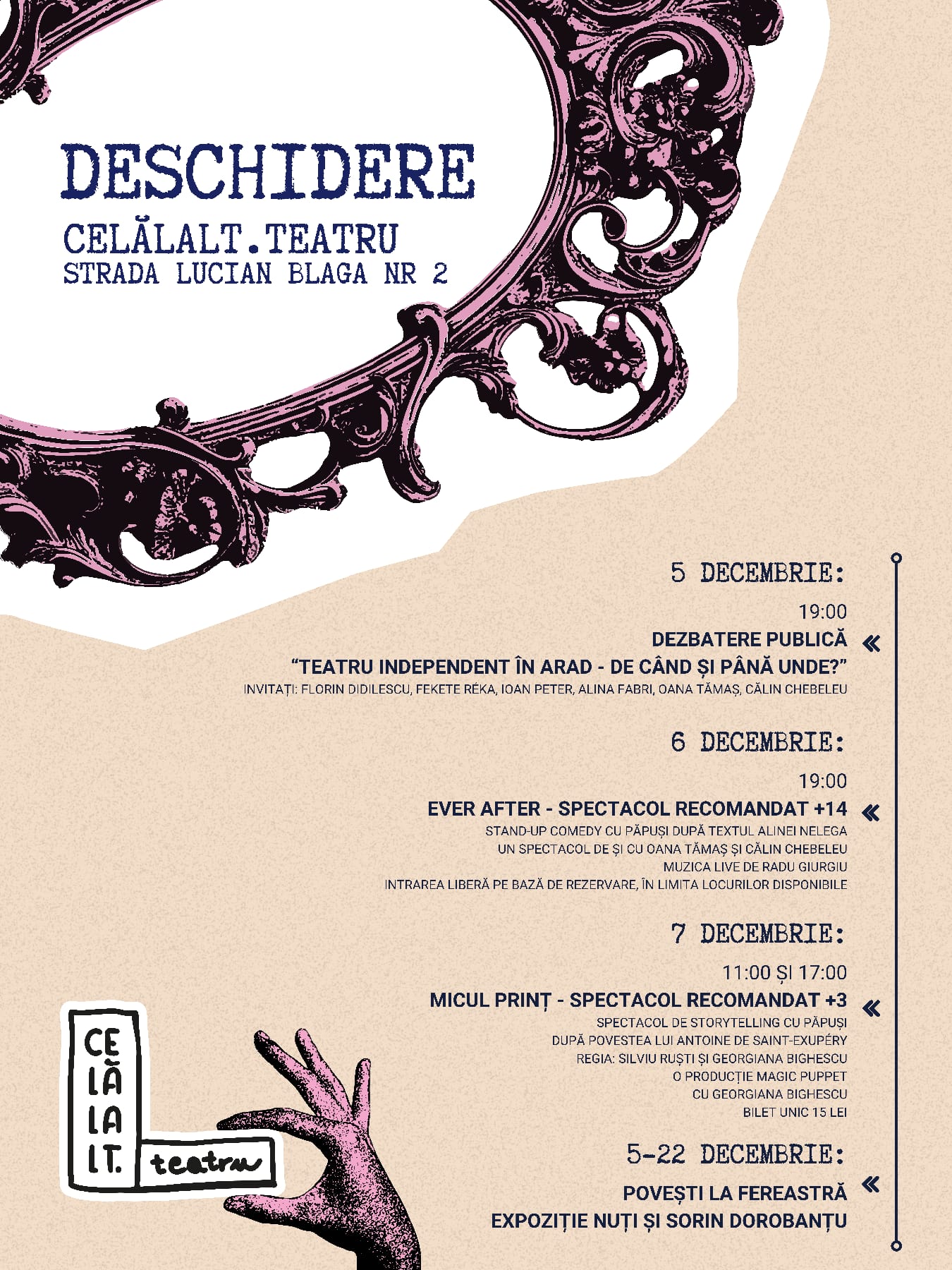 Inauguraea spațiului cultural va continua pe 6 decembrie, de la ora 19, cu spectacolul „Ever after”. Spectacolul de stand-up comedy cu păpuși, după textul Alinei Nelega, este recomandat celor cu vârsta de pest 14 ani. Spectacolul îi are în distribuție pe Oana Tămaș și Călin Chebeleu, iar muzica live este asigurată de Radu Giurgiu. Intrarea va fi liberă, pe bază de rezervare, în limita locurilor disponibile.