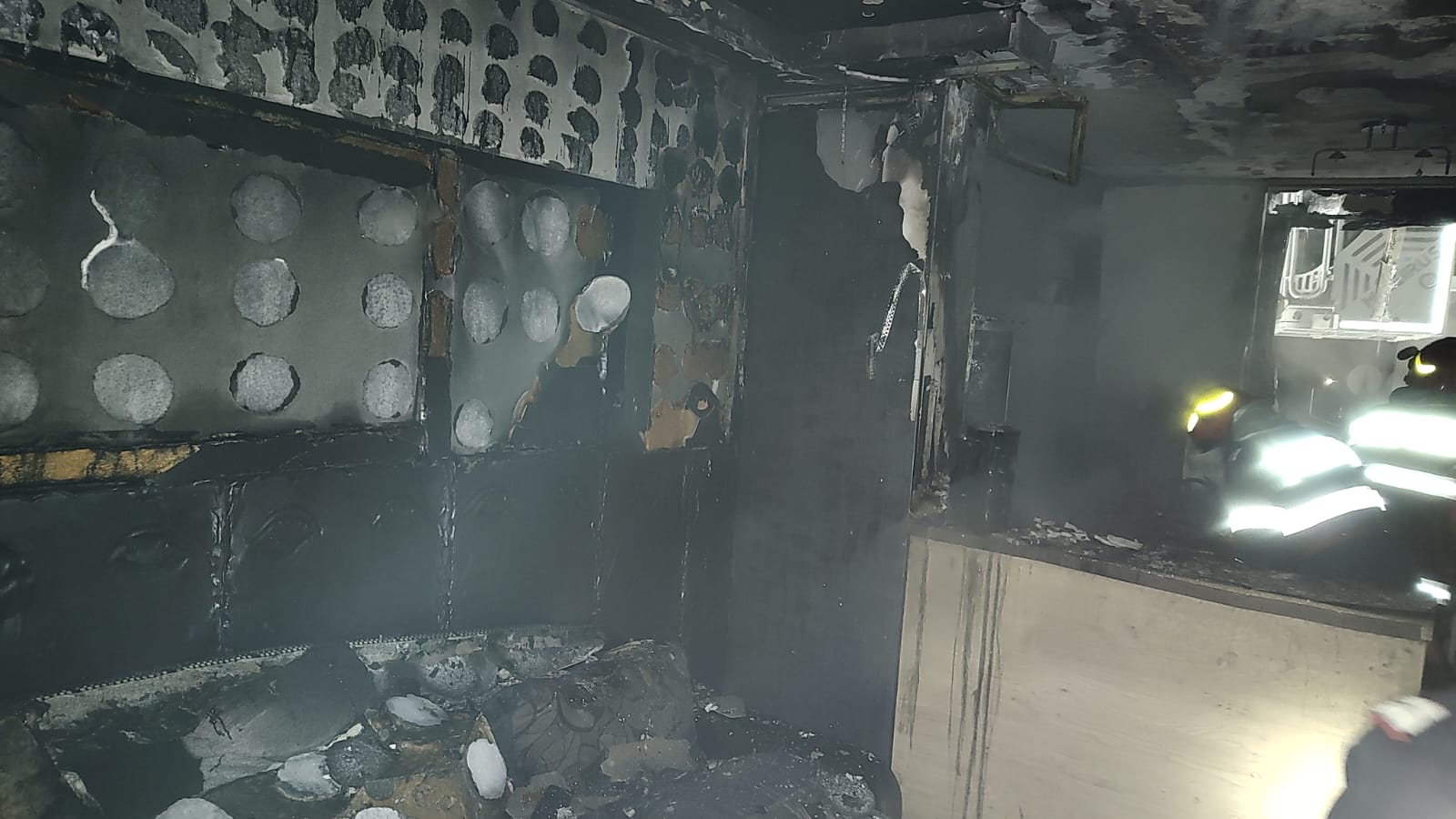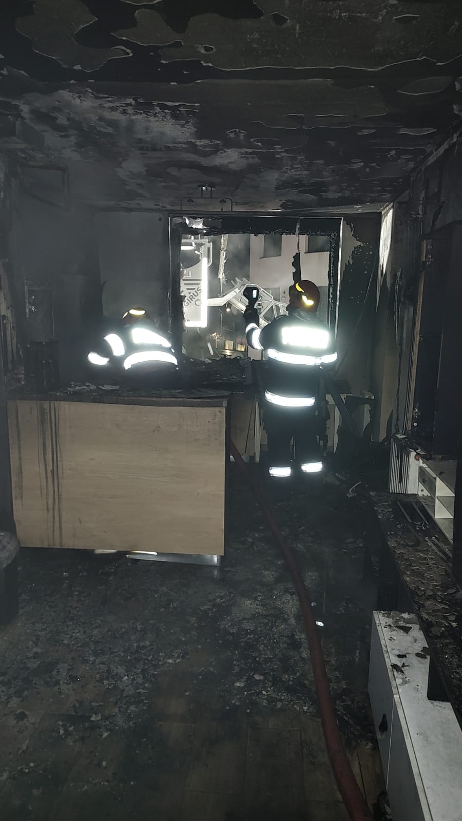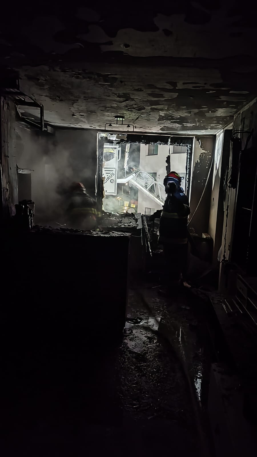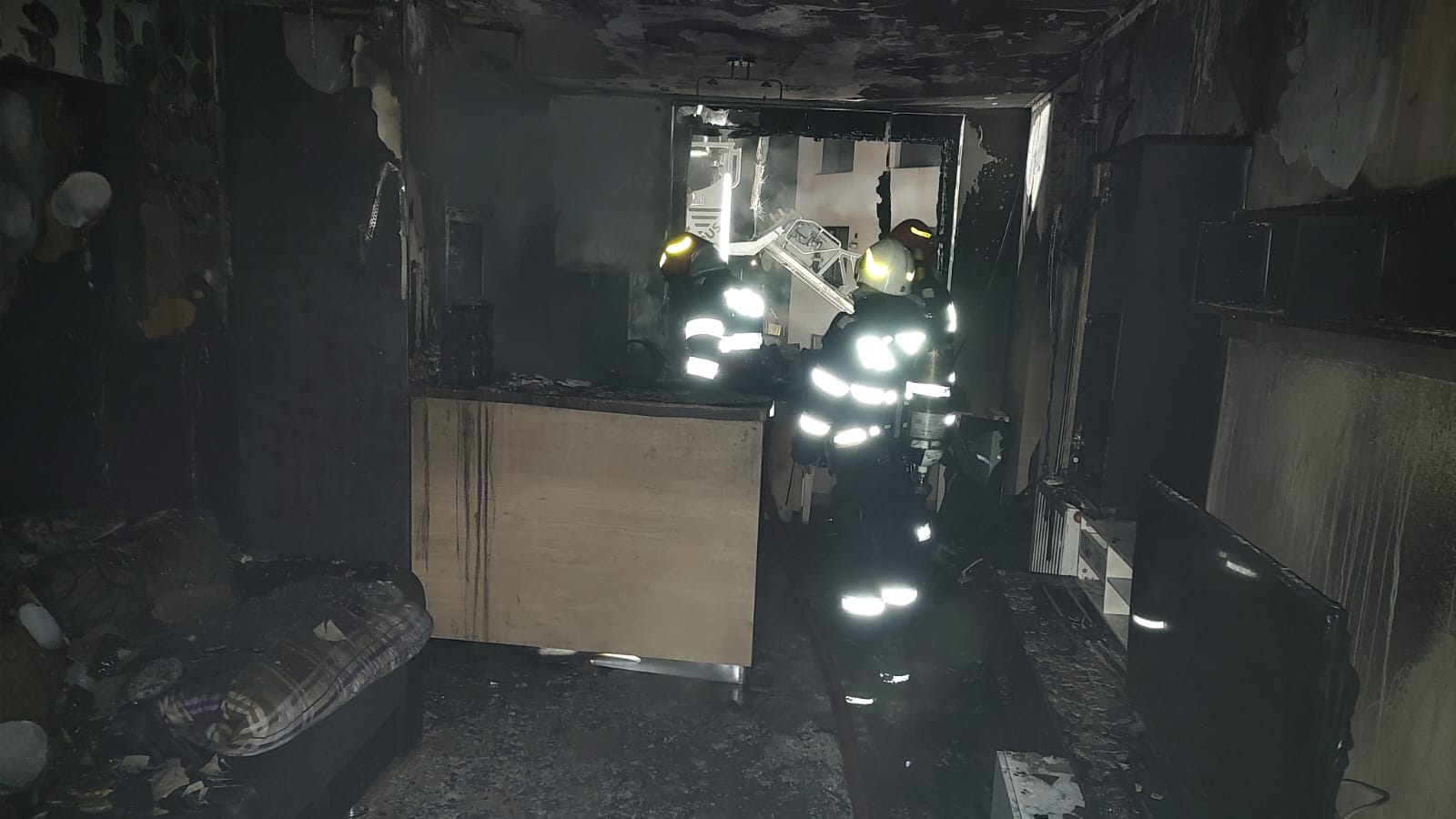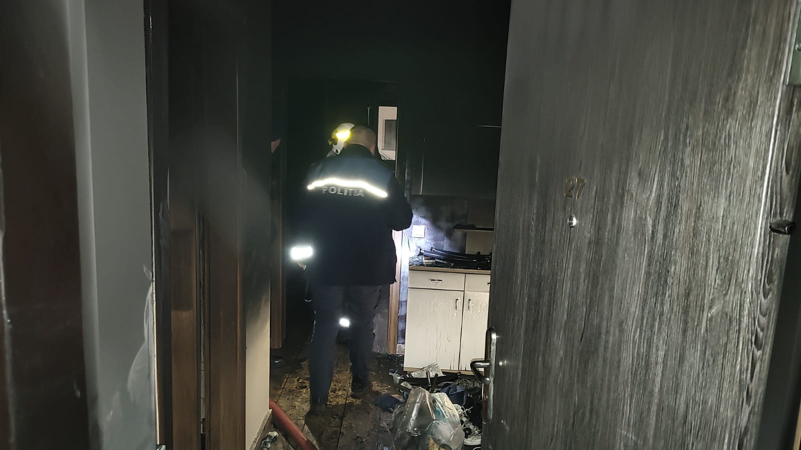 “În urma incendiului, apartamentul a fost distrus – parte de foc, parte fiind avariat de fum” și ce o rămas, de pompieri.