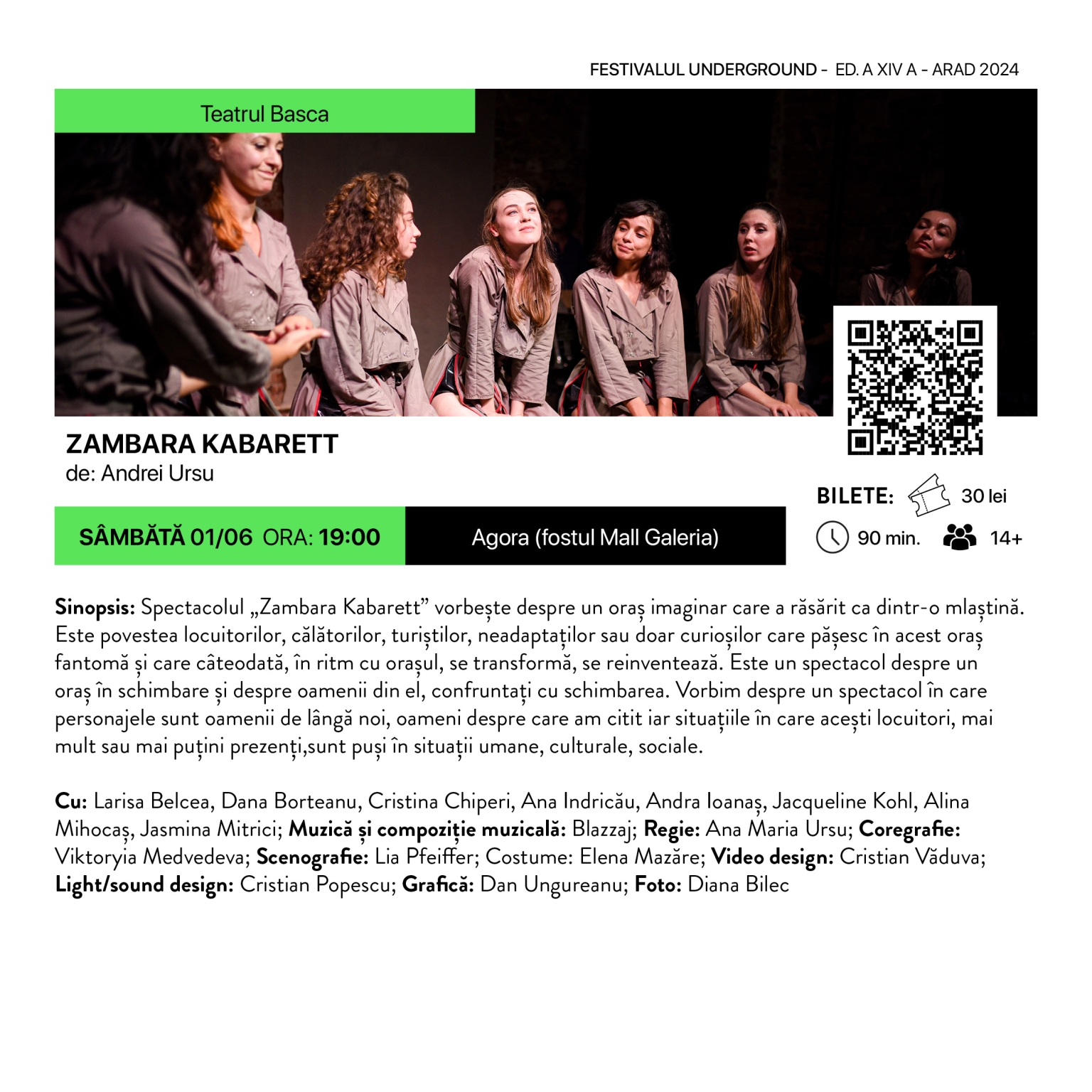 De la ora 19 ne mutăm în Agora – fostul mall Galleria, unde vor sosi actorii Teatrului Basca. Aceștia sosesc în Underground cu spectacolul „Zambara Kabarett”, de Andrei Ursu. Spectacolul este destinat audienței cu vârsta minimă de 14 ani.