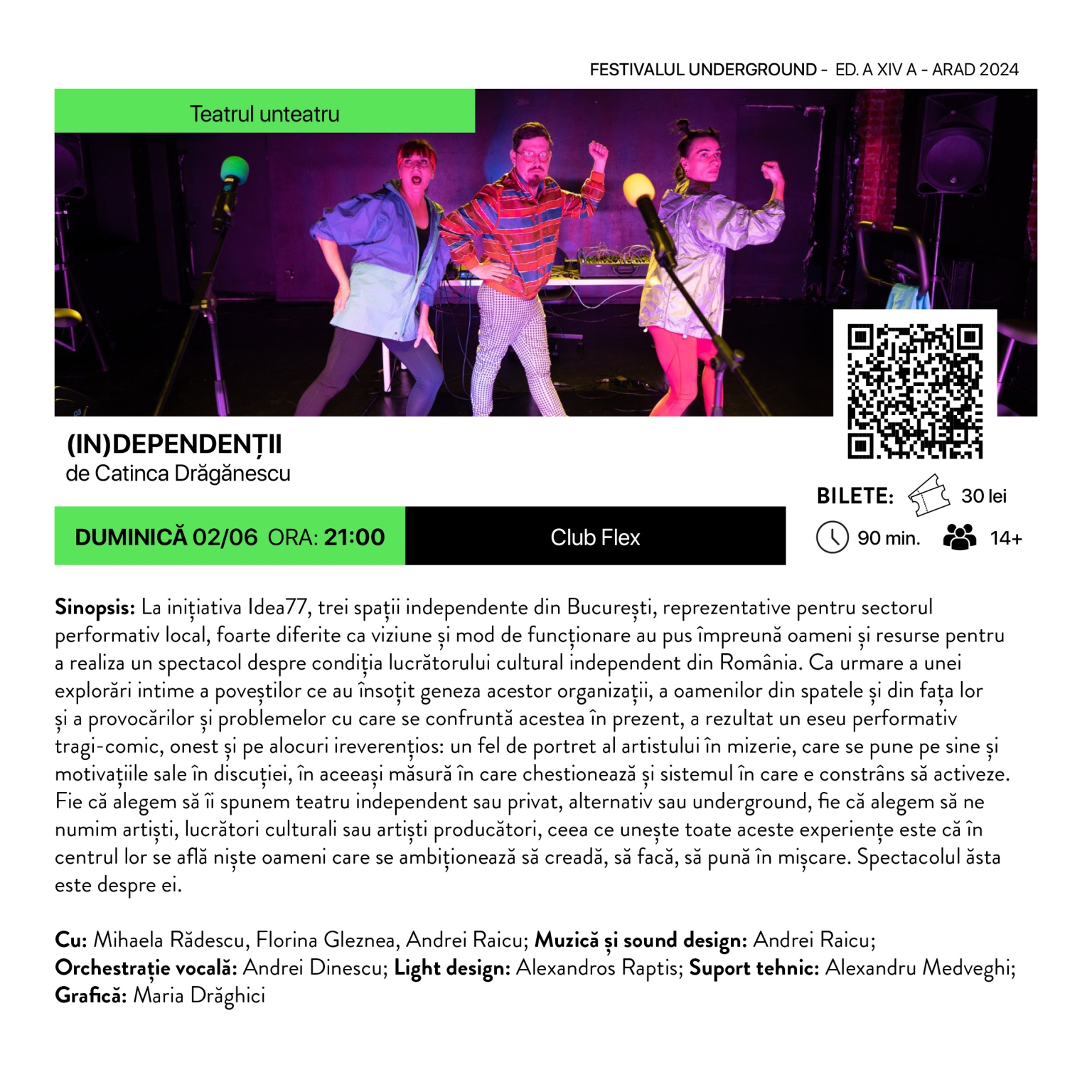 Așadar, în acest weekend vom avea ocazia să vedem jucând peste 30 de actori în nouă spectacole ce vor fi puse în scenă în patru locuri din municipiul Arad, unele mai convenționale, altele mai puțin obișnuite. Biletele costă 30 de lei pentru fiecare reprezentație. Sau, pentru cei care vor să ia parte la mai multe spectacole, cei de la Underground au și abonamente care permit accesul la zece spectacole. Și biletele, și abonamentele, pot fi cumpărate de pe www.eventbook.ro/festival/underground-festival. Programul complet al Underground Festival 2024, inclusiv al secțiunii de film independent și al conferințelor Underground – www.undergroundfestival.ro