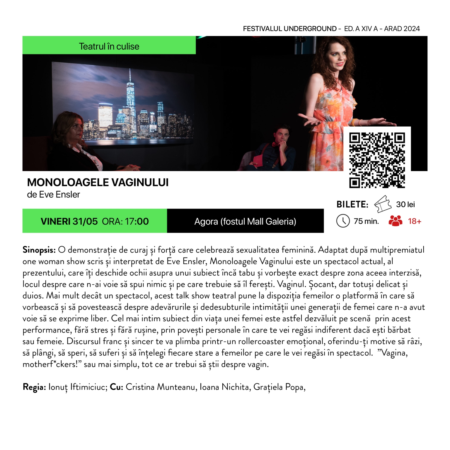 Vineri, 31 mai, în prima zi de festival, vom avea trei spectacole, în trei locuri din oraș. Primul va fi de la ora 17, în fostul mall Galleria, de pe Calea Aurel Vlaicu. „Monoloagele Vaginului”, de Eve Ensler, pus în scenă de actorii Teatrului În Culise, din capitală, va deschide festivalul. Spațiul de joc va fi un fost magazin aflat la etajul unu al centrului comercial, iar voluntarii festivalului ne vor îndruma spre el. Cu o durată de 75 de minute, spectacolul este destinat celor cu vârsta minimă de 18 ani.