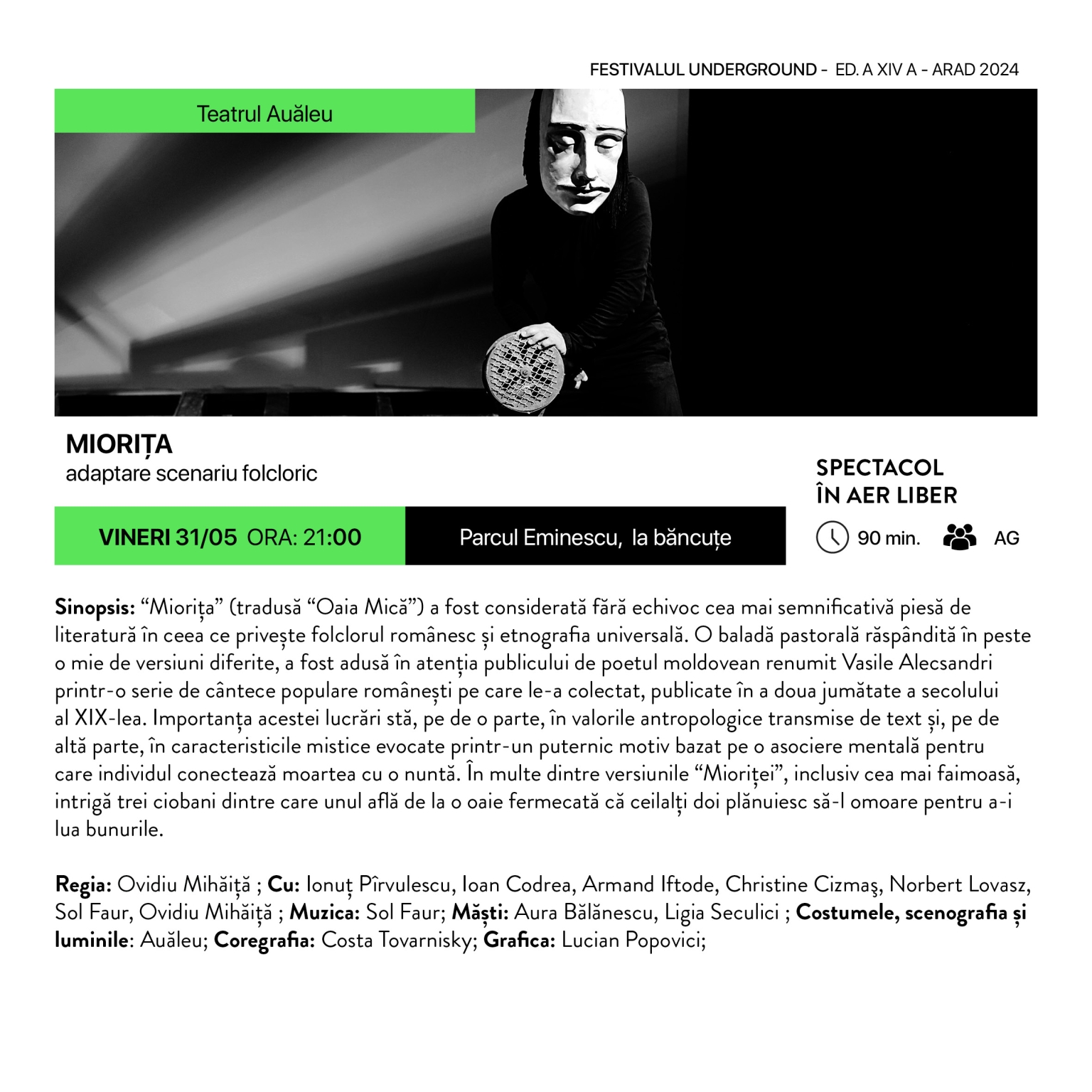 Prima zi de festival se încheie în Parcul Eminescu, unde, de la ora 21, artiștii timișoreni de la teatrul independent Auăleu vor da viață personajelor din Miorița. Spectacolul are o durată de 90 de minute și va fi jucat în aer liber, în zona „La băncuțe”.