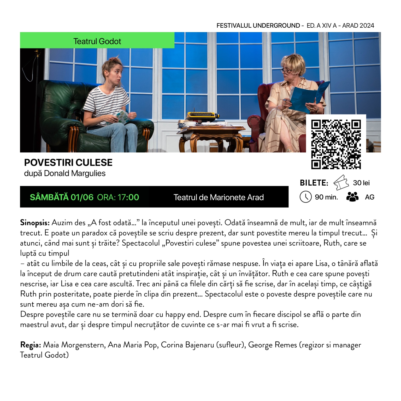 Ziua de sâmbătă 1 iunie, începe într-un spațiu convențional: Teatrul de Marionete. Începând cu ora 17, aici vor sosi actorii teatrului bucureștean Godot, care vor aduce în fața publicului festivalier spectacolul „Povestiri alese”, bazat pe scrierile lui Donald Margulies.
