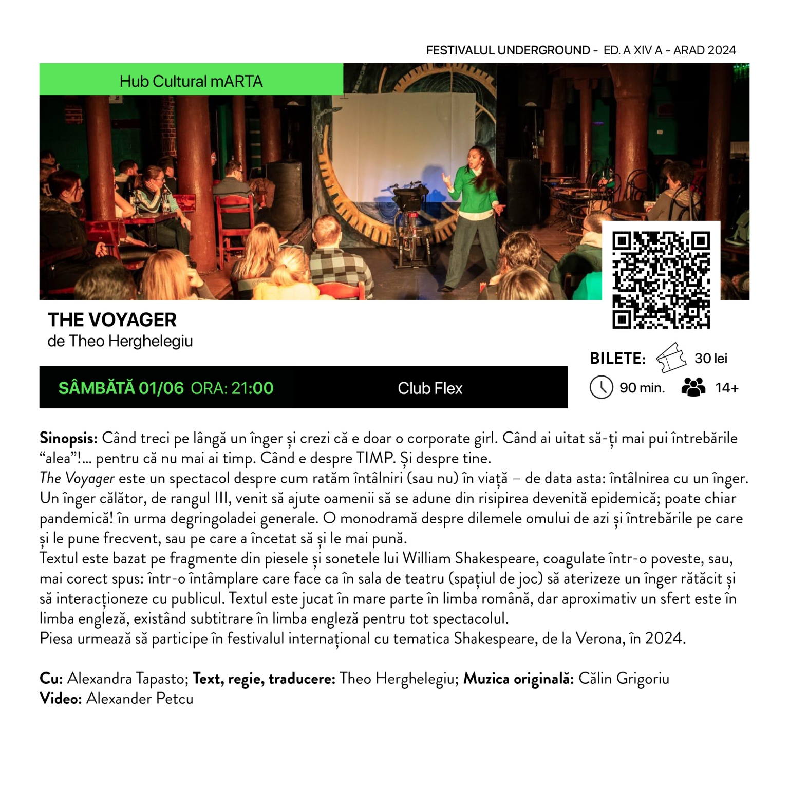 Ziua de sâmbătă se încheie cu o producție locală, a Hubului Cultural mARTA, organizator al festivalului. Este vorba despre „Voyager”, de Theo Herghelegiu, ce va fi jucat în clubul Flex, de la ora 21. Spectacolul este recomandat celor cu vârsta peste 14 ani.