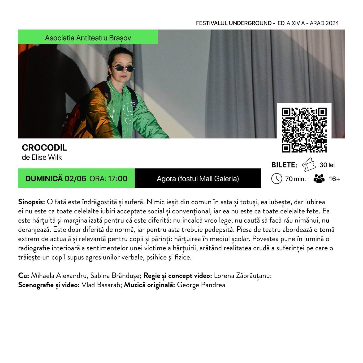 Duminica vine cu „Crocodil”, de Elise Wilk, pe care artiștii Asociației Antiteatru din Brașov îl vor prezenta publicului, de la ora 17, la Agora, fostul mall de pe Calea Aurel Vlaicu. Destinat spectatorilor cu vârste peste 16 ani, spectacolul durează în jur de 70 de minute.