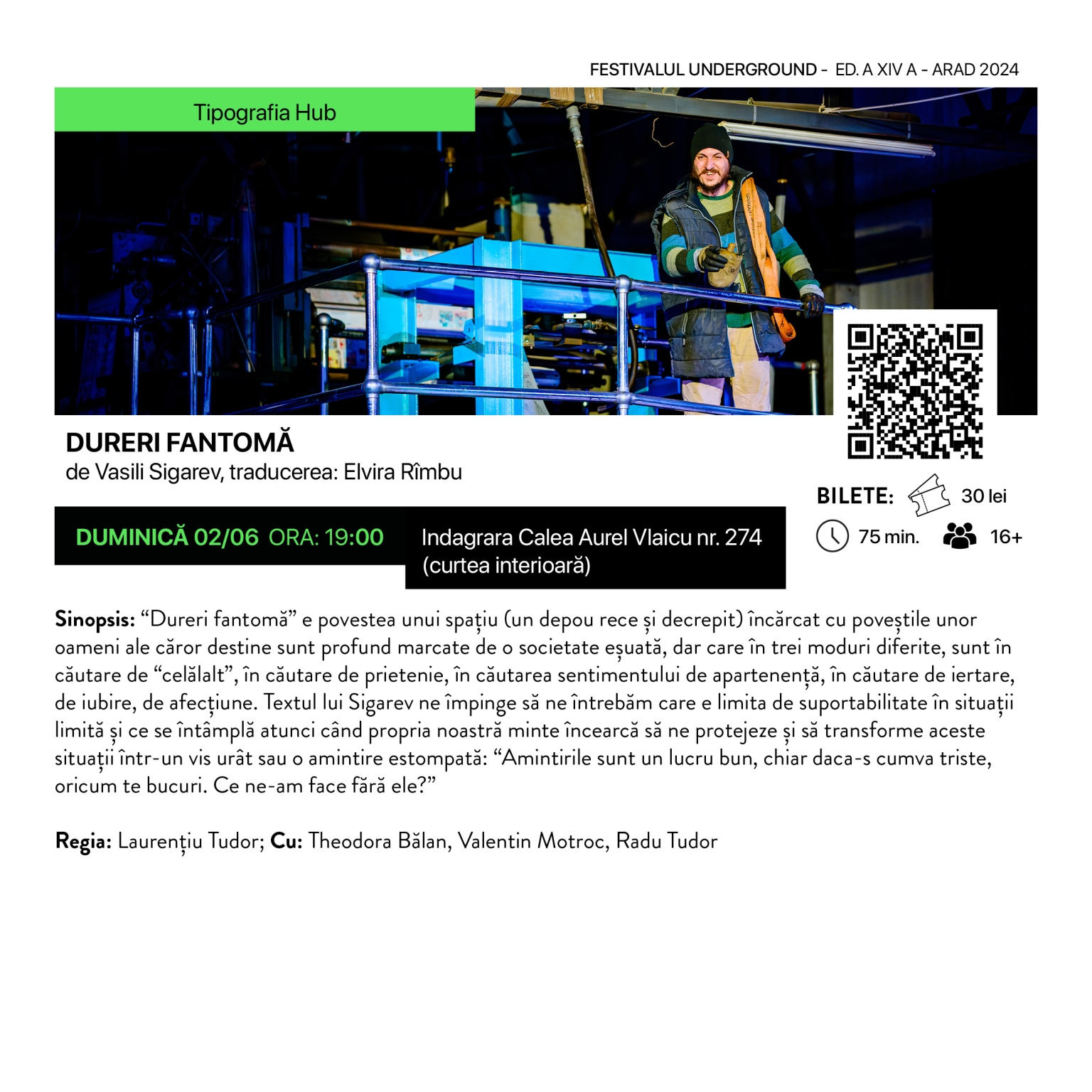 Festivalul continuă cu „Dureri fantomă”, într-un spațiu industrial abandonat ce se transformă pentru câteva zile în sală de teatru. Este vorba despre o veche hală a fostei fabrici Indagrara, de pe Calea Aurel Vlaicu nr.247. Spațiul este în curtea interioară a fabricii, iar voluntarii Underground ne vor ghida. „Dureri fantomă”, spectacolul celor de la Tipografia Hub, va fi jucat acolo de la ora 19. Vârsta minimă: 16 ani.