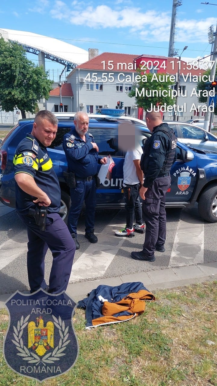 ”În jurul orei 11:20, imediat după semnalarea faptei de tâlhărie prin Dispeceratul Poliției Locale, respectiv solicitarea acordării de sprijin, de către Poliția Națională, polițiștii locali s-au mobilizat în teren, în vederea căutării individului. După aproximativ 20 de minute, C.I., în vârstă de 19 ani, domiciliat într-o localitate din județul Arad, a fost identificat de patrula Poliției Locale, pe Calea Aurel Vlaicu, după semnalmentele transmise de Poliția Națională și predat Secției 2 Vlaicu, în vederea cercetărilor pentru infracțiunea de tâlhărie. Menționăm că obiectul furat a fost recuperat după prinderea individului.